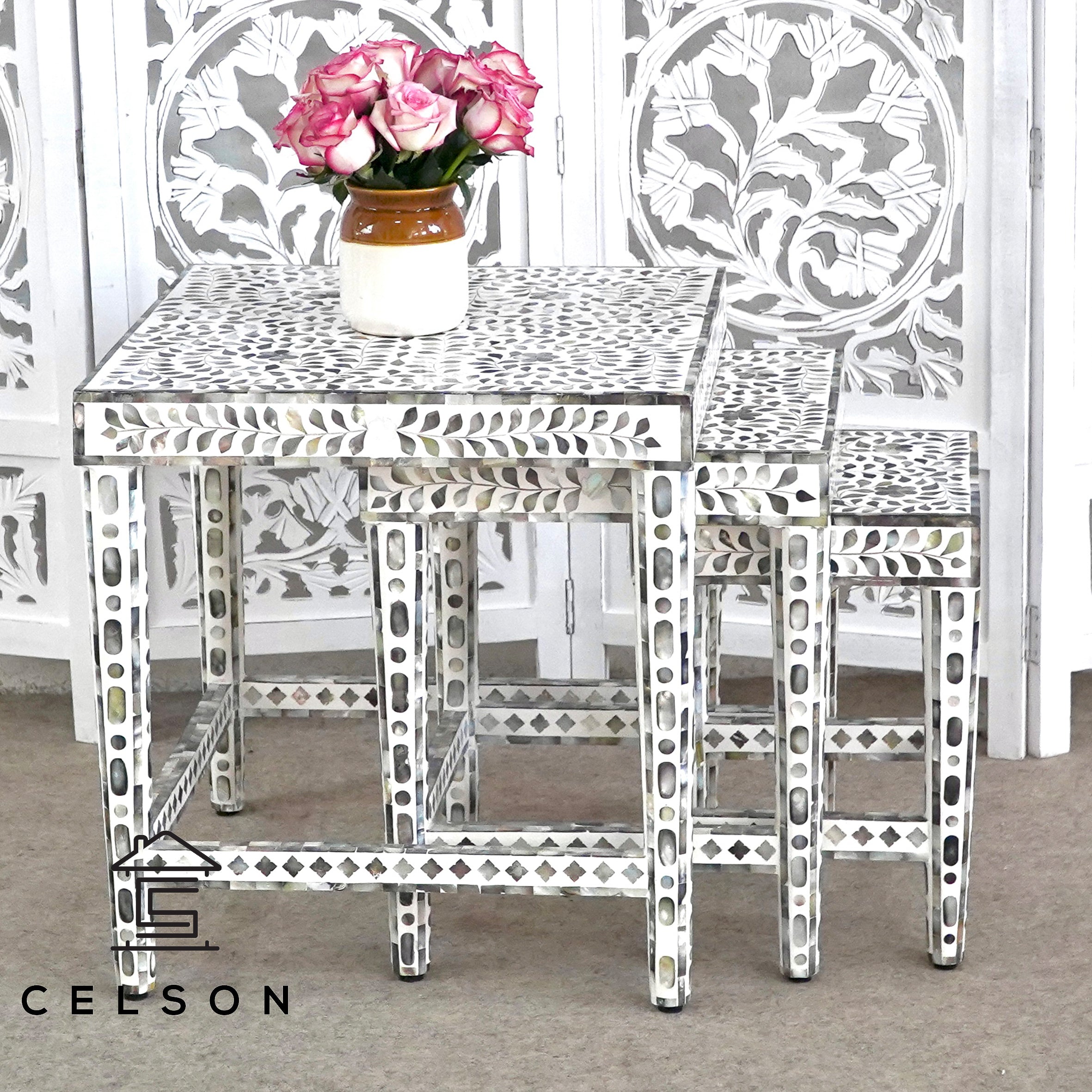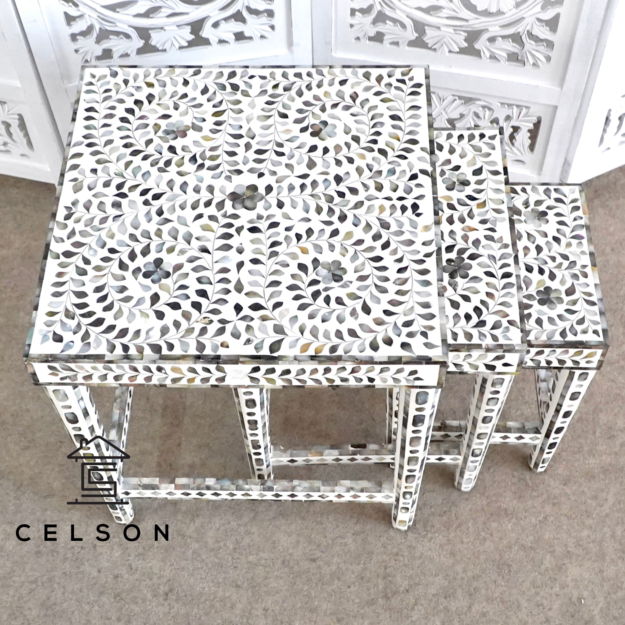 MOP Inlay Nesting table Set of 3 is styled for today's home. The rich, classy finish will impress everyone. The smaller tables can be pulled out for entertaining or tucked away when space is limited.