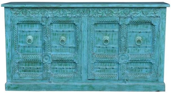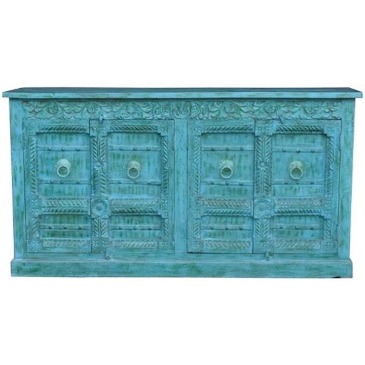 This distressed blue sideboard is an absolute eye catcher with its hand carved design and complimenting metal pulls.
