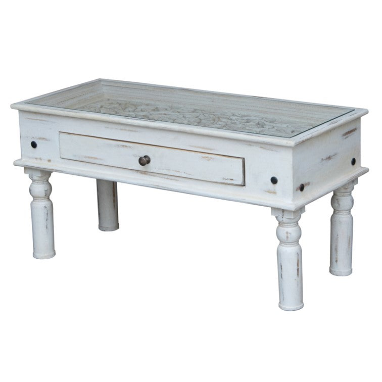 What makes it so striking is that the top is completely hand carved and it’s finished in a white washed style. It comes with a glass top for ease of use.
