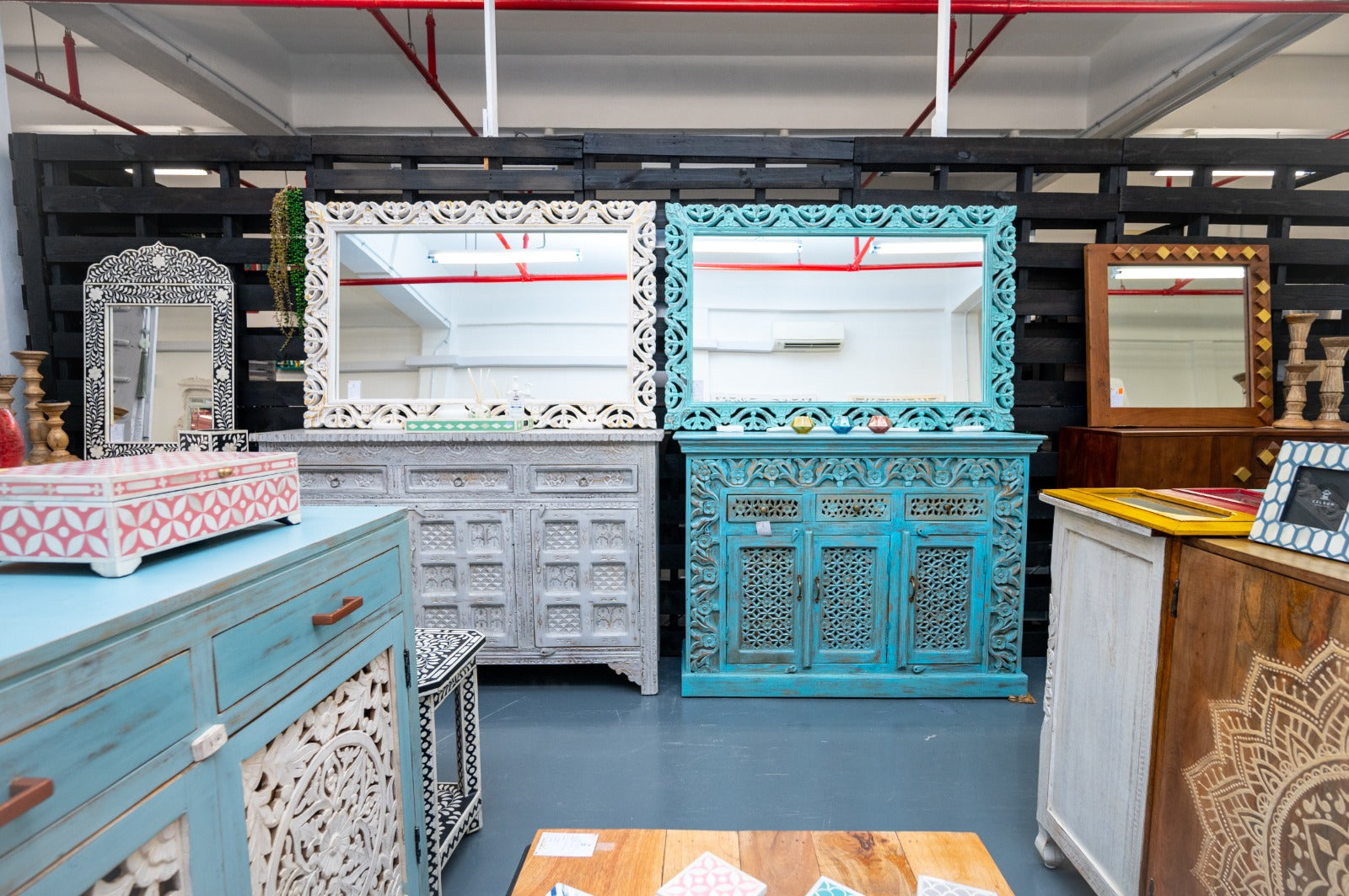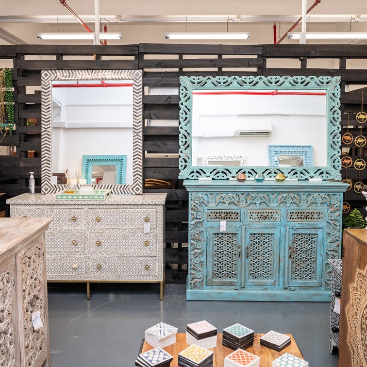 This distressed blue sideboard is an absolute eye catcher with its hand carved design and complimenting metal pulls.