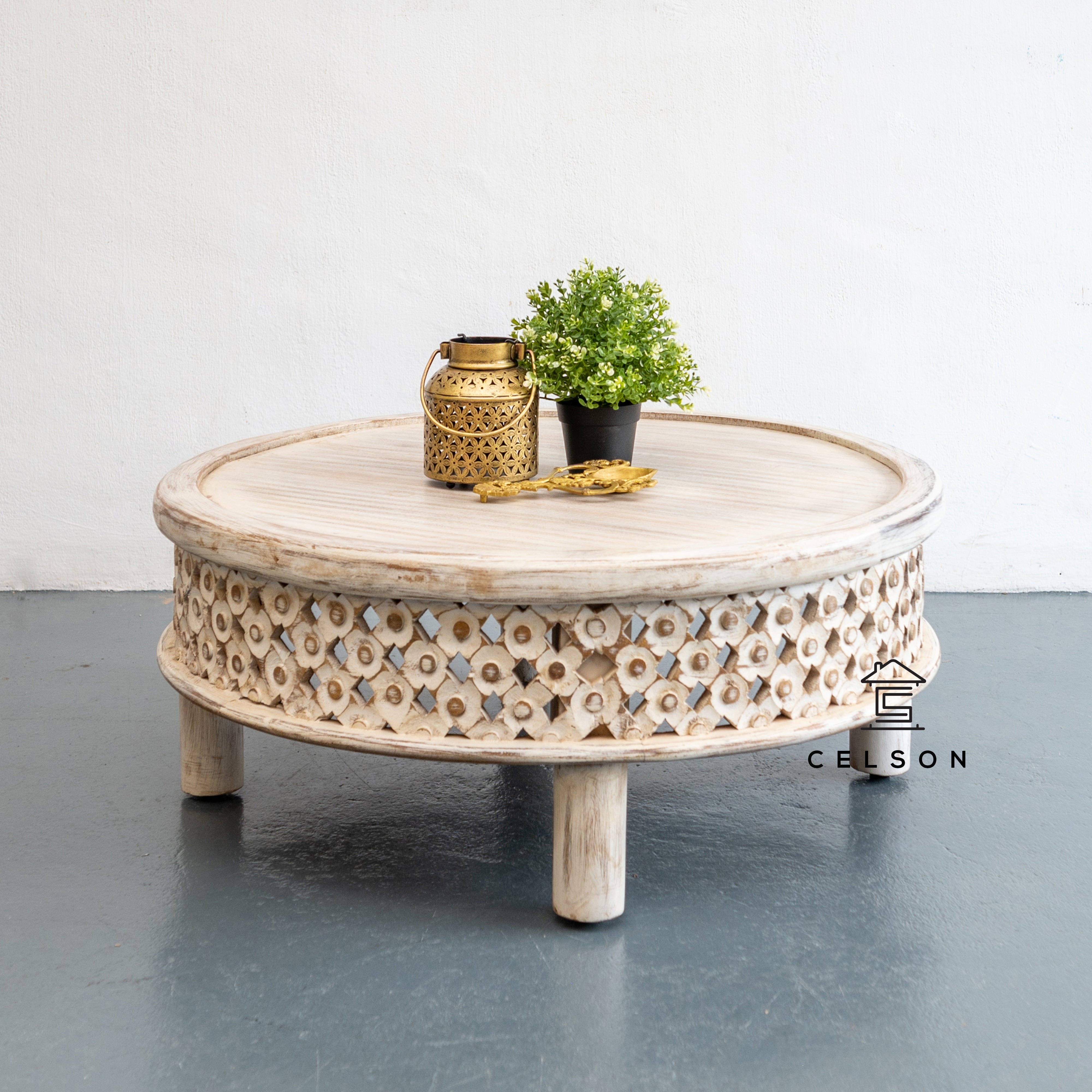 And here’s another gorgeous piece for you to have your coffee on! It’s got an overall “jaali” border and is finished in a natural, white washed and natural with black finish.