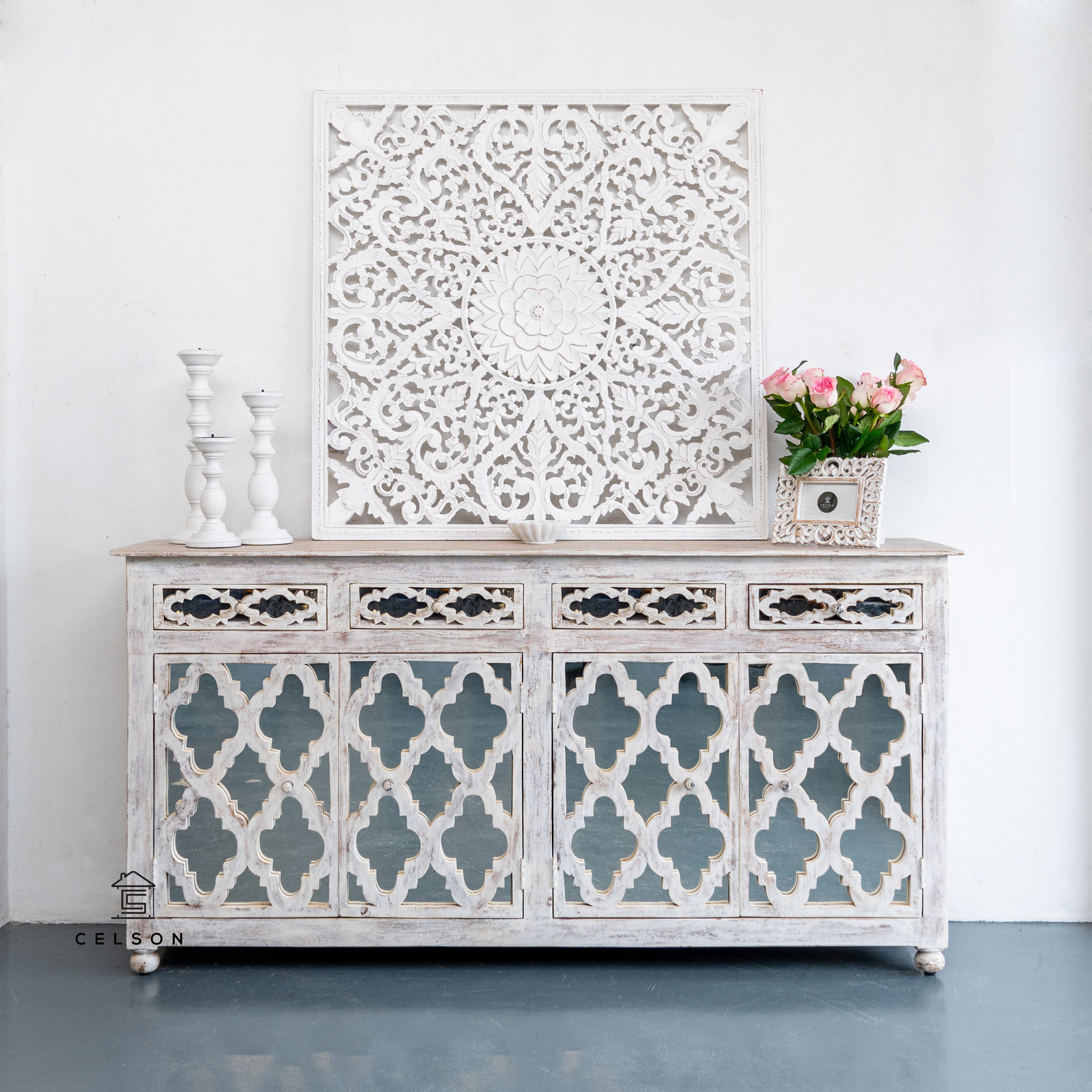 Like this white washed finish sideboard, it’ll help brighten up the space, will not look overwhelming and make for great storage area! Just combine it with some of our home decor items and you’ll have a new favorite corner in the house.