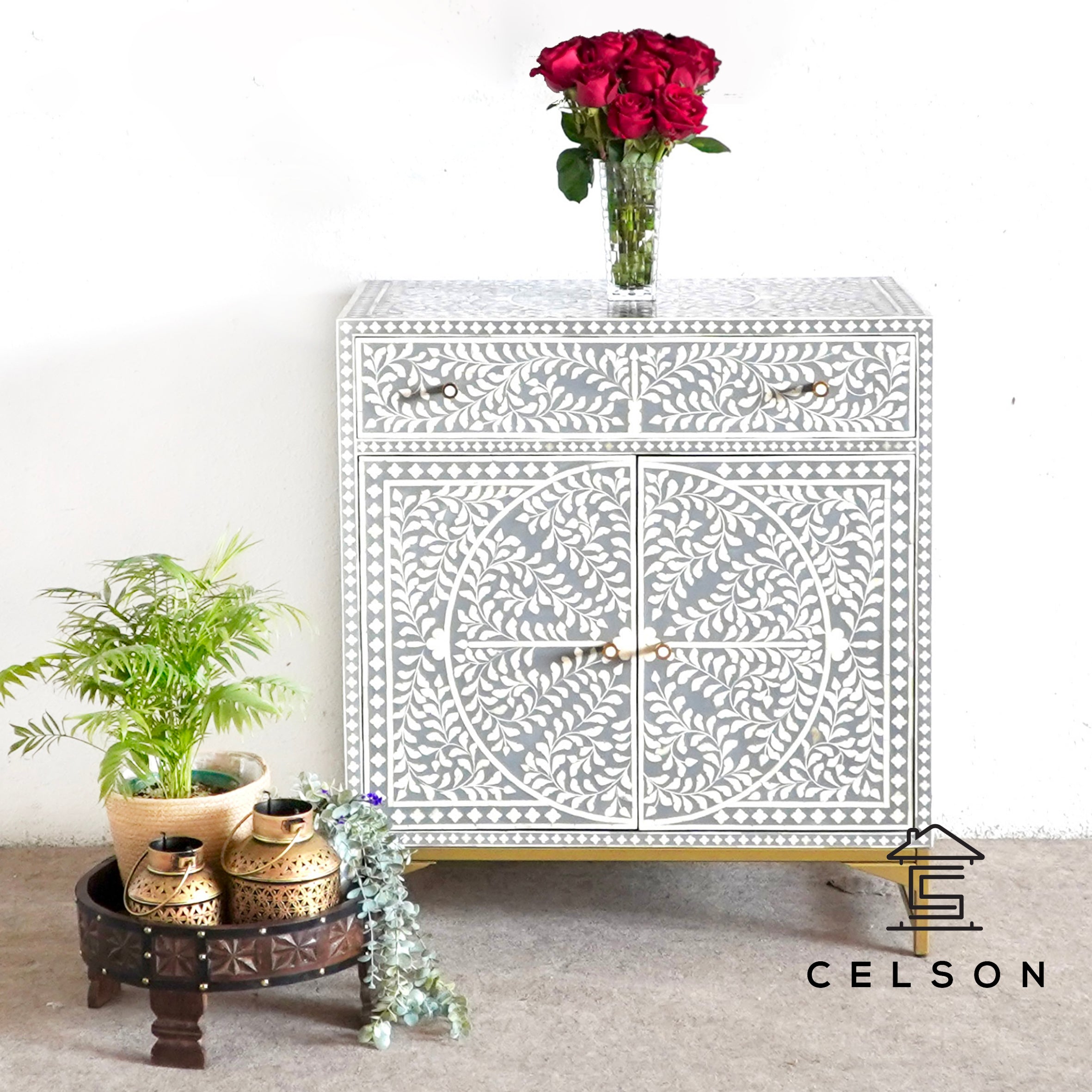 This floral-patterned bone inlay cabinet in soothing grey is a true work of art - designed to offer charm and everyday functionality with spacious storage inside.