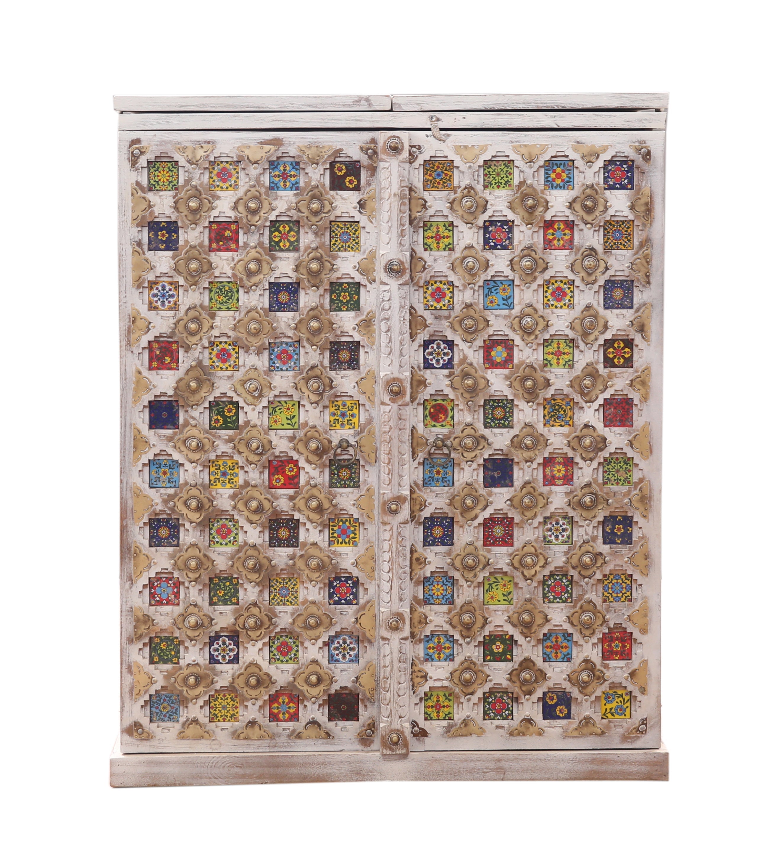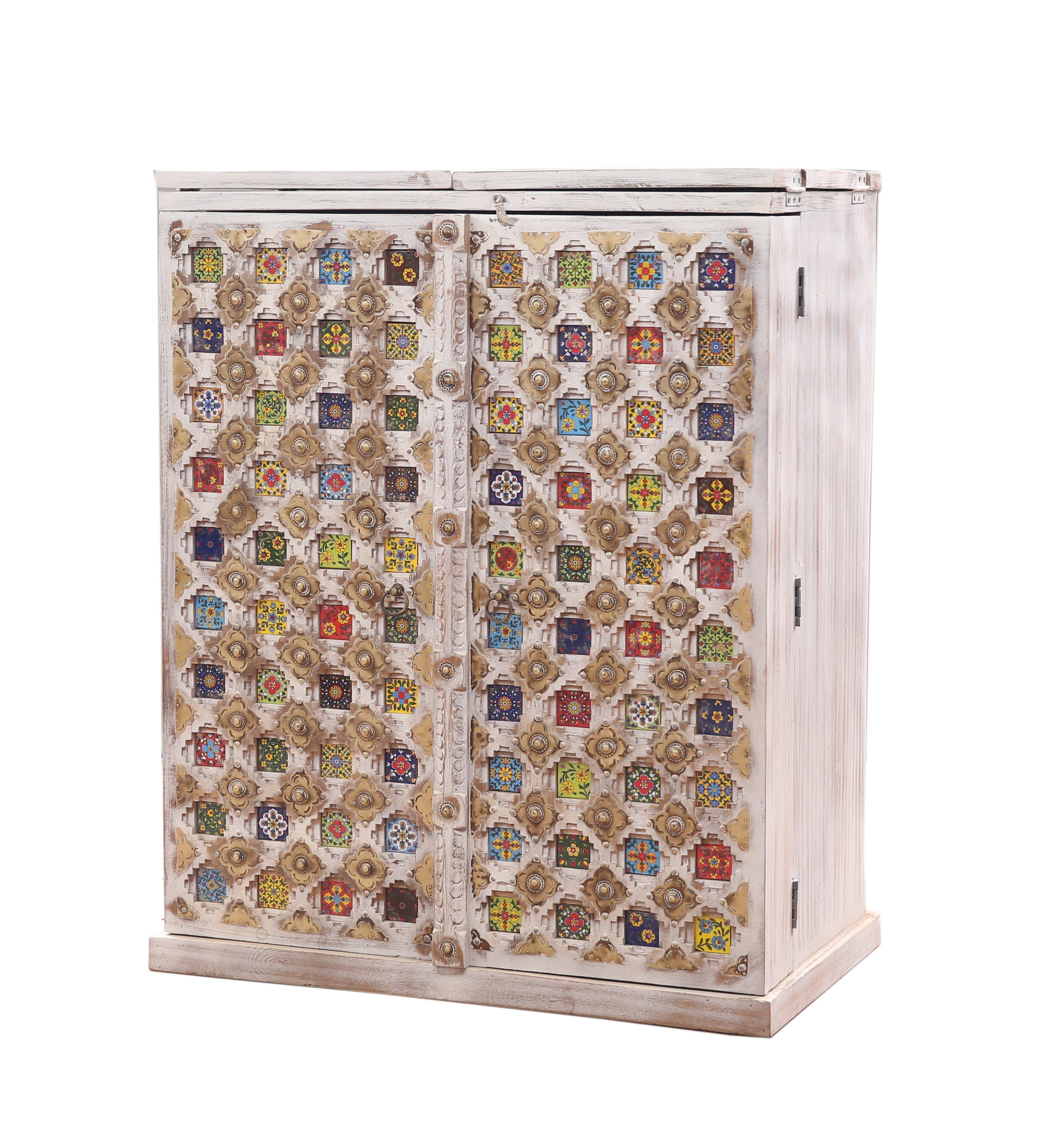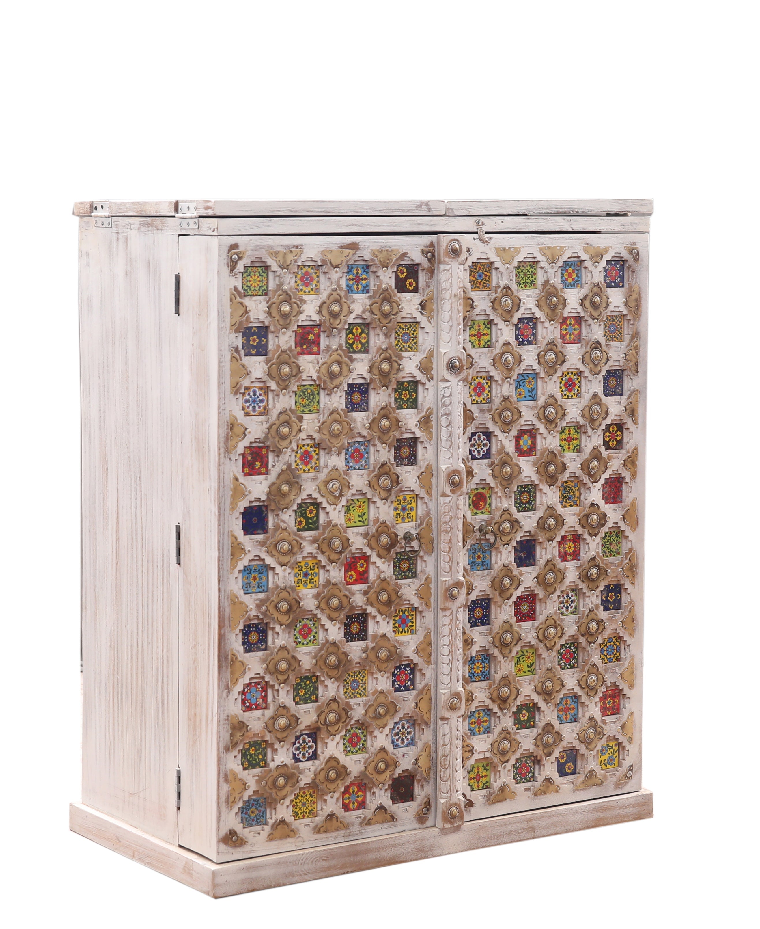 This one is sure to make you stop your search with multi colored tile exterior & lovely finish. Multiple shelves make for the perfect storage space for bottles, glasses and other bar accessories.