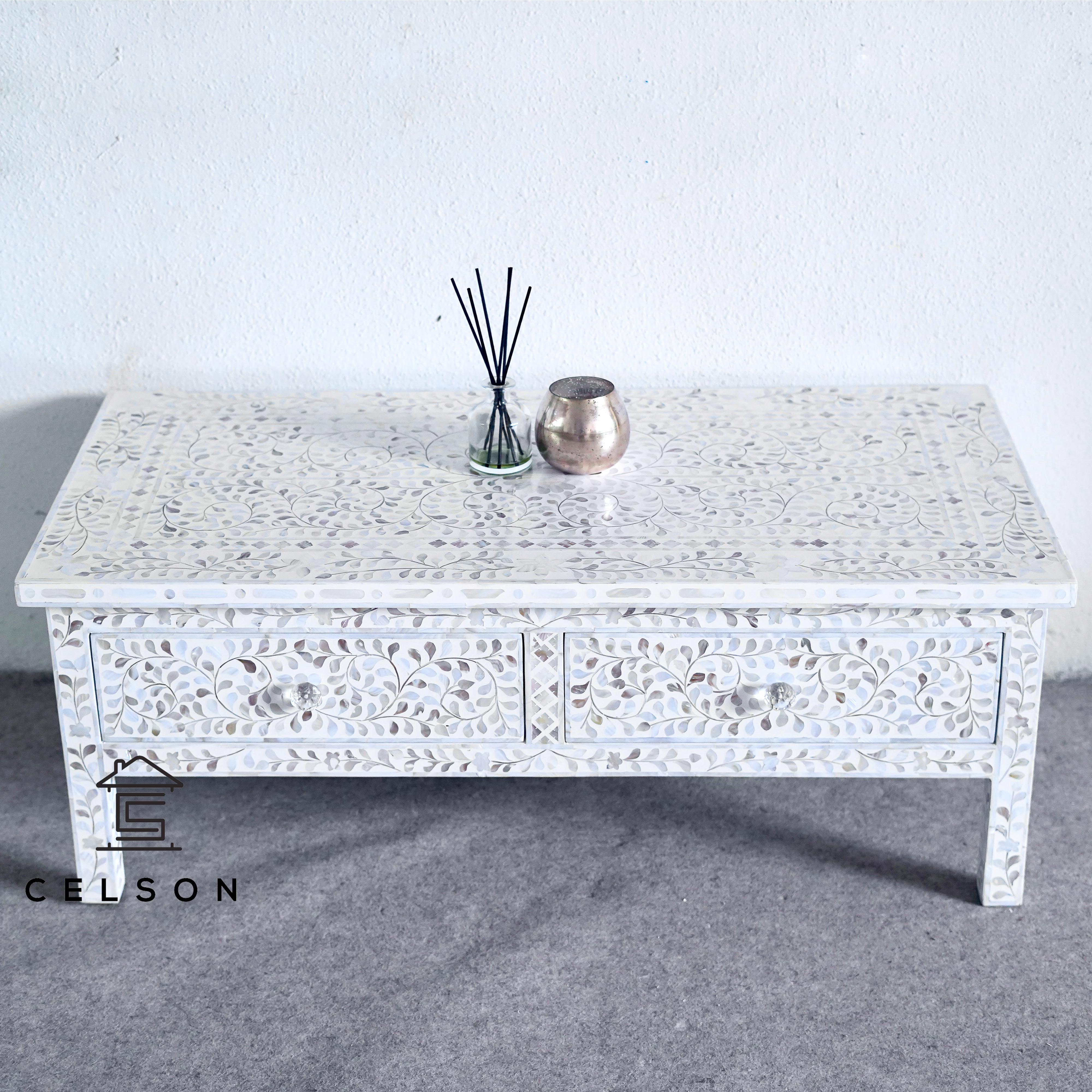 Step into a space of warmth and elegance!  Our mother of pearl inlay coffee table, with its artful hand-inlaid design, transforms every coffee break into a luxurious experience. A true work of art that elevates your living room’s style!