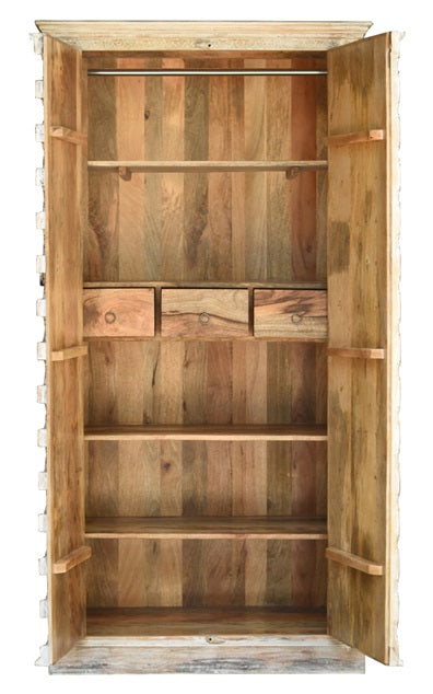 Our James almirah, having sturdy mango wood construction with beautiful natural and white washed finish works perfectly with the color scheme of any bedroom, living room, and hallway or entryway.
