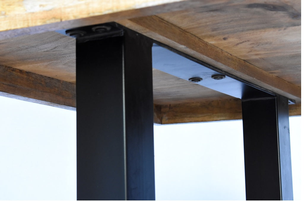 It comes with a simple wooden top with a geometrical design & black metal legs that make the table very stable & sturdy.