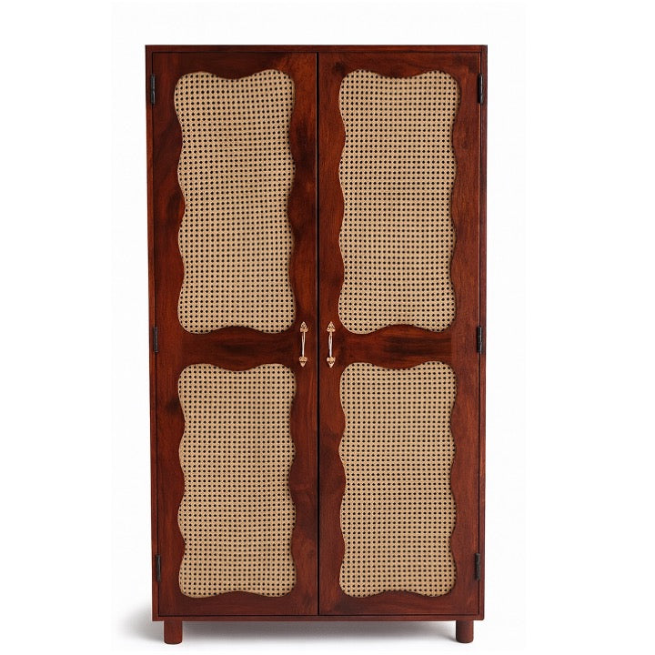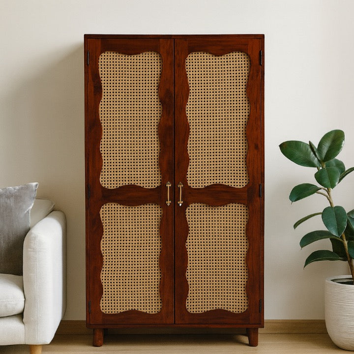 Rooted in tradition, crafted by hand - a wooden almirah with rattan jali doors that celebrates artisanal beauty.