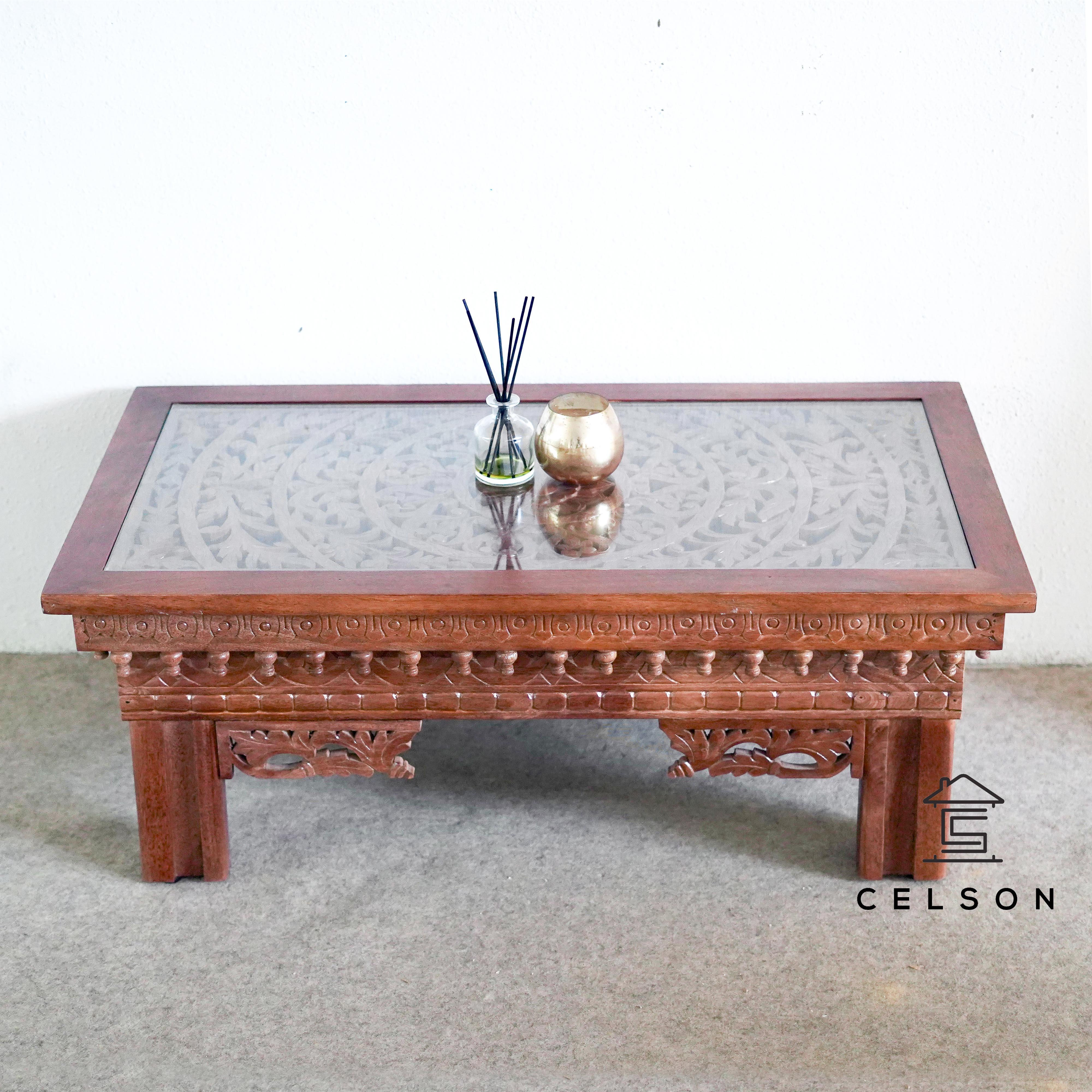Beautifully hand-carved with a glass top for easy upkeep, this coffee table adds elegance and warmth to any space.