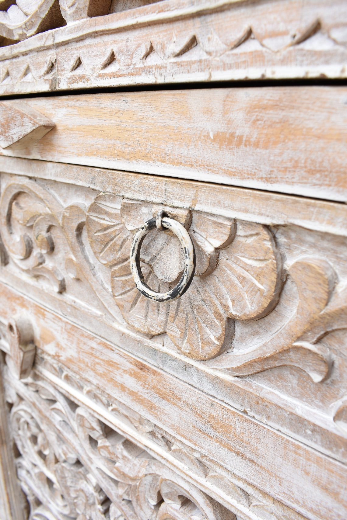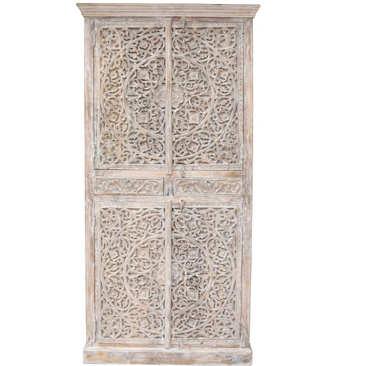 Our hand carved, distressed finish Colin  tall cabinet can be a perfect cupboard. It has multiple shelves with 4 door  inside to neatly store all your clothes and two drawer at the center!