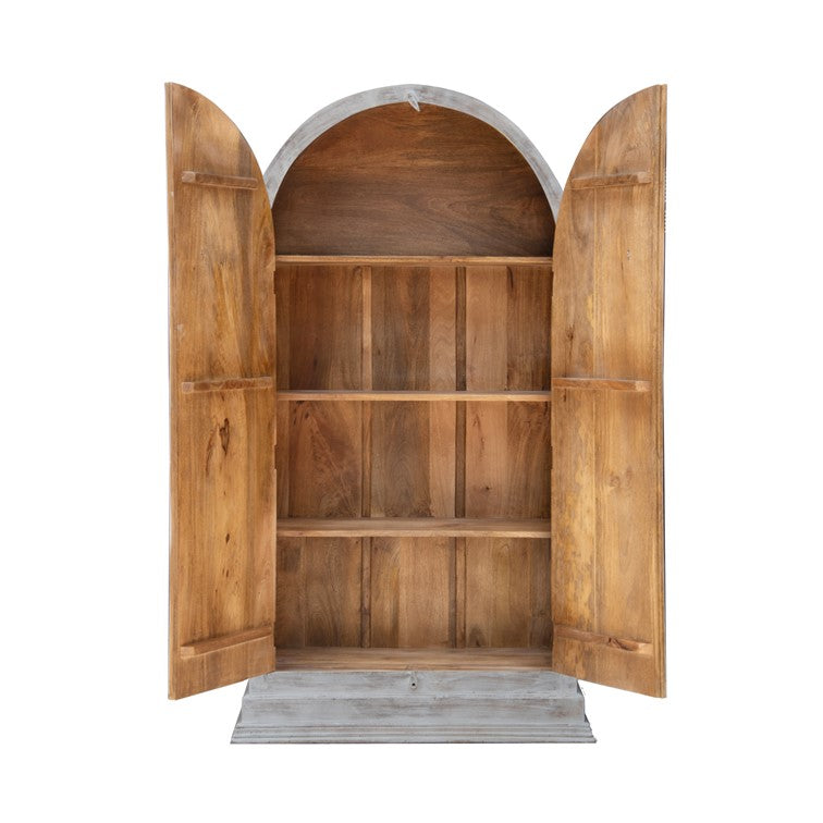 Our hand carved, distressed white tall cabinet can be a perfect cupboard. It has multiple shelves inside to neatly store all your clothes.