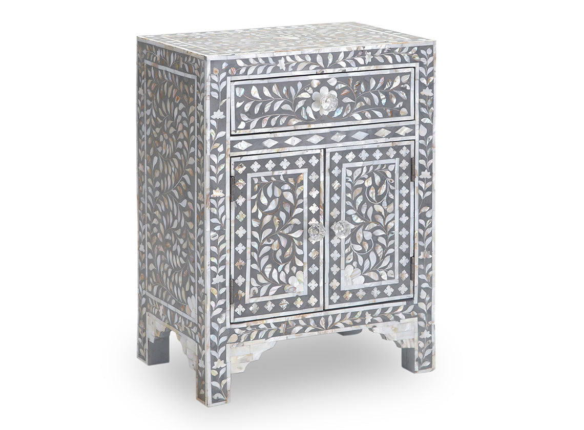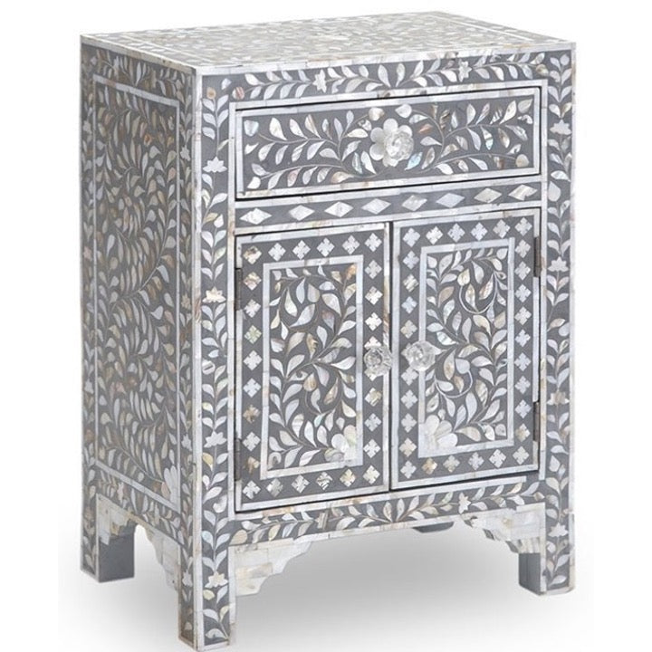 Our Mother of pearl inlay bed side tables not only look gorgeous but are super practical too! They have a drawer on top for your absolute bed time essentials and a bigger compartment with two doors below the drawer to hold other items.