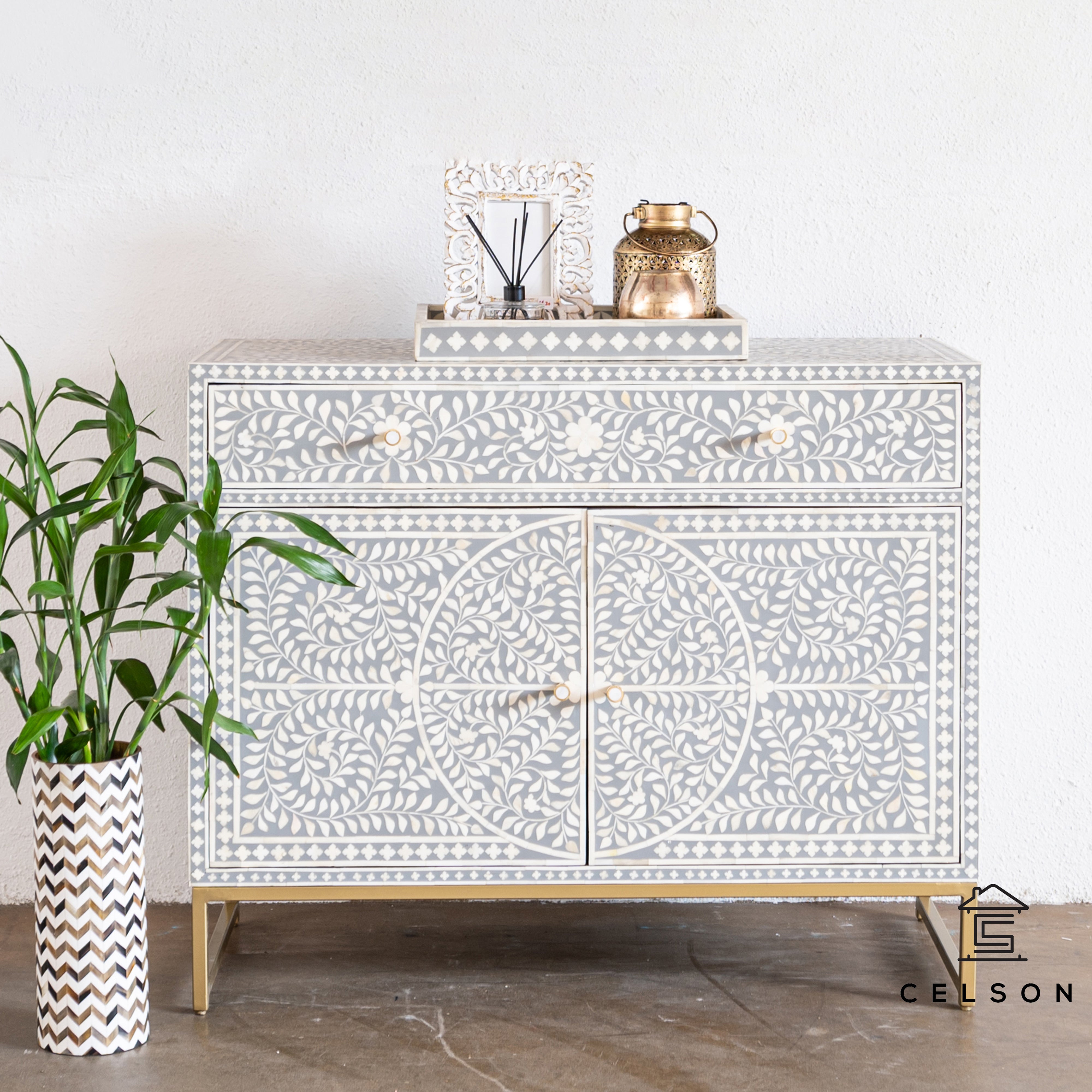 Say hello to this adorable bone inlay chest, which enjoys a lot of popularity! This chest comes with 1 long drawers and 2 doors, which are set in grey color with a floral pattern all over & have brass knobs.