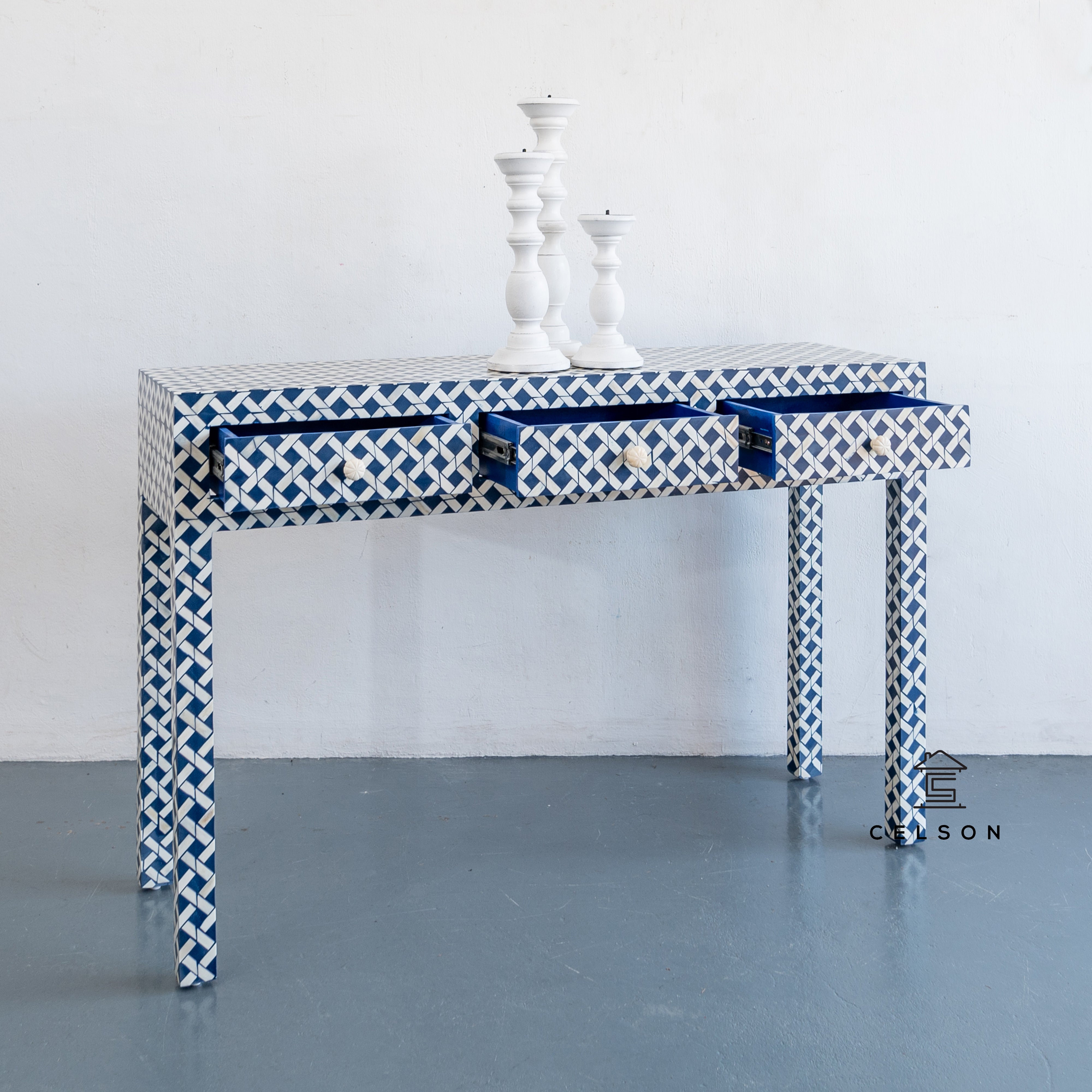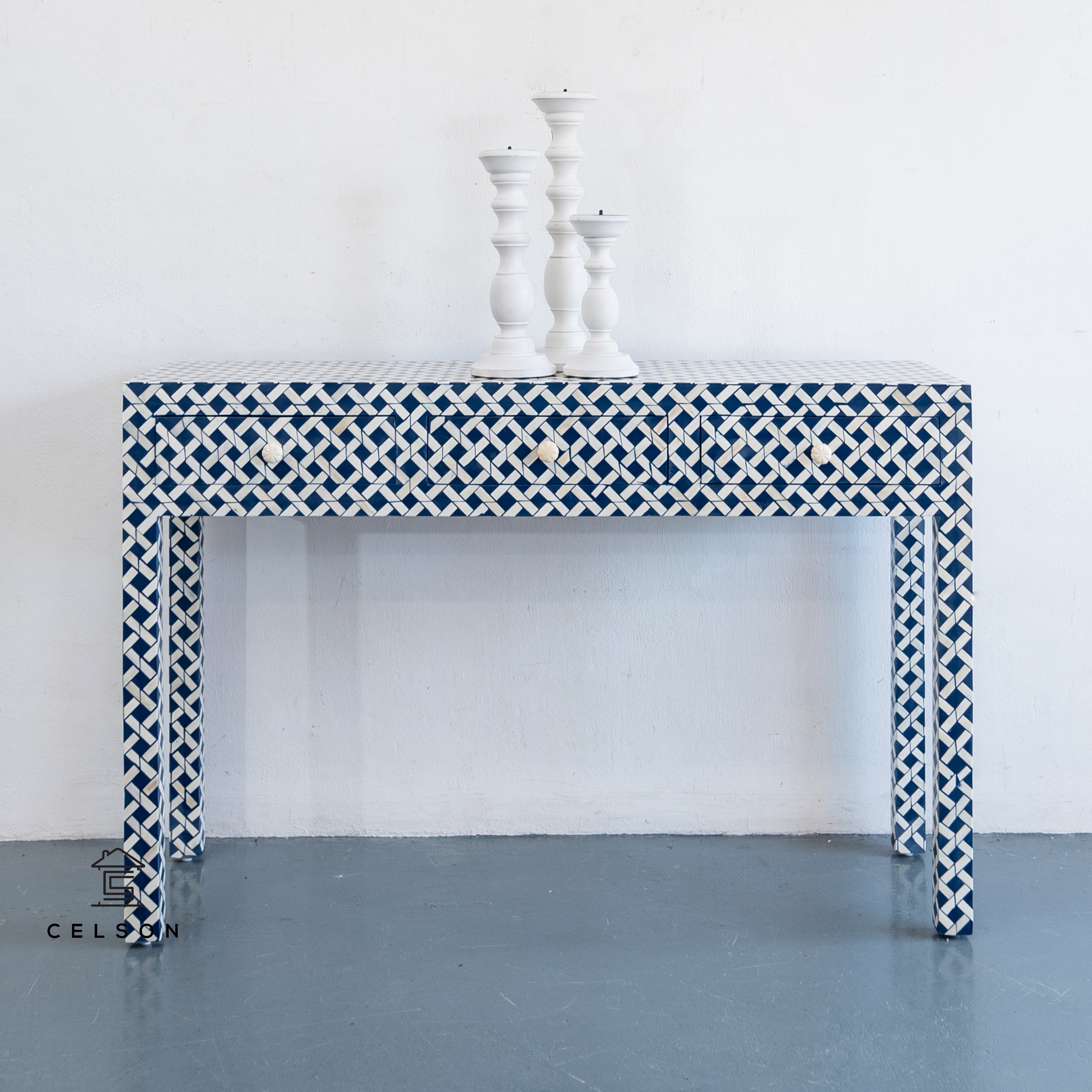 This stunning bone inlay console table comes with 3 drawers set in the gorgeous pattern in blue colour.