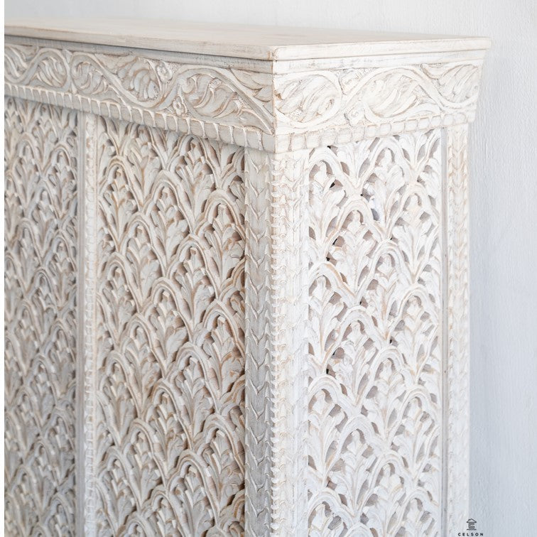 And this bar cabinet is perfect for the purpose! Its hand carved exterior and multiple shelves/racks inside will provide storage for all your bottles and glassware while displaying them well.