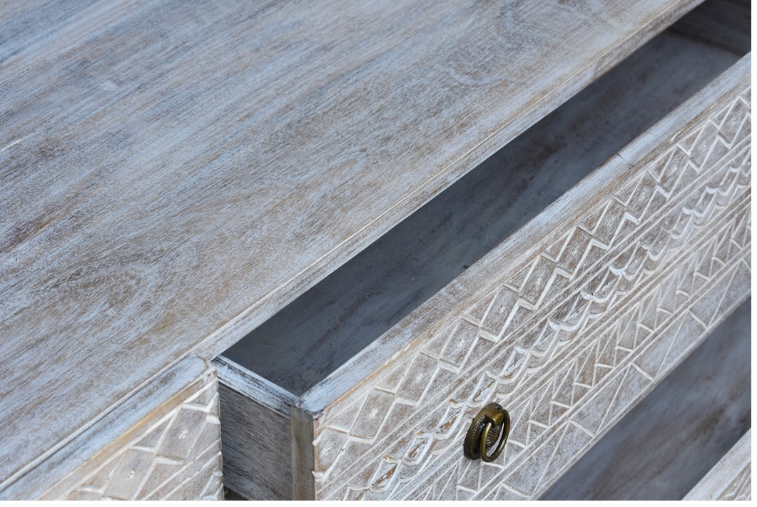With a floral hand carved pattern & white washed finish, this chest of drawer is bound to make you feel like modern day royalty!