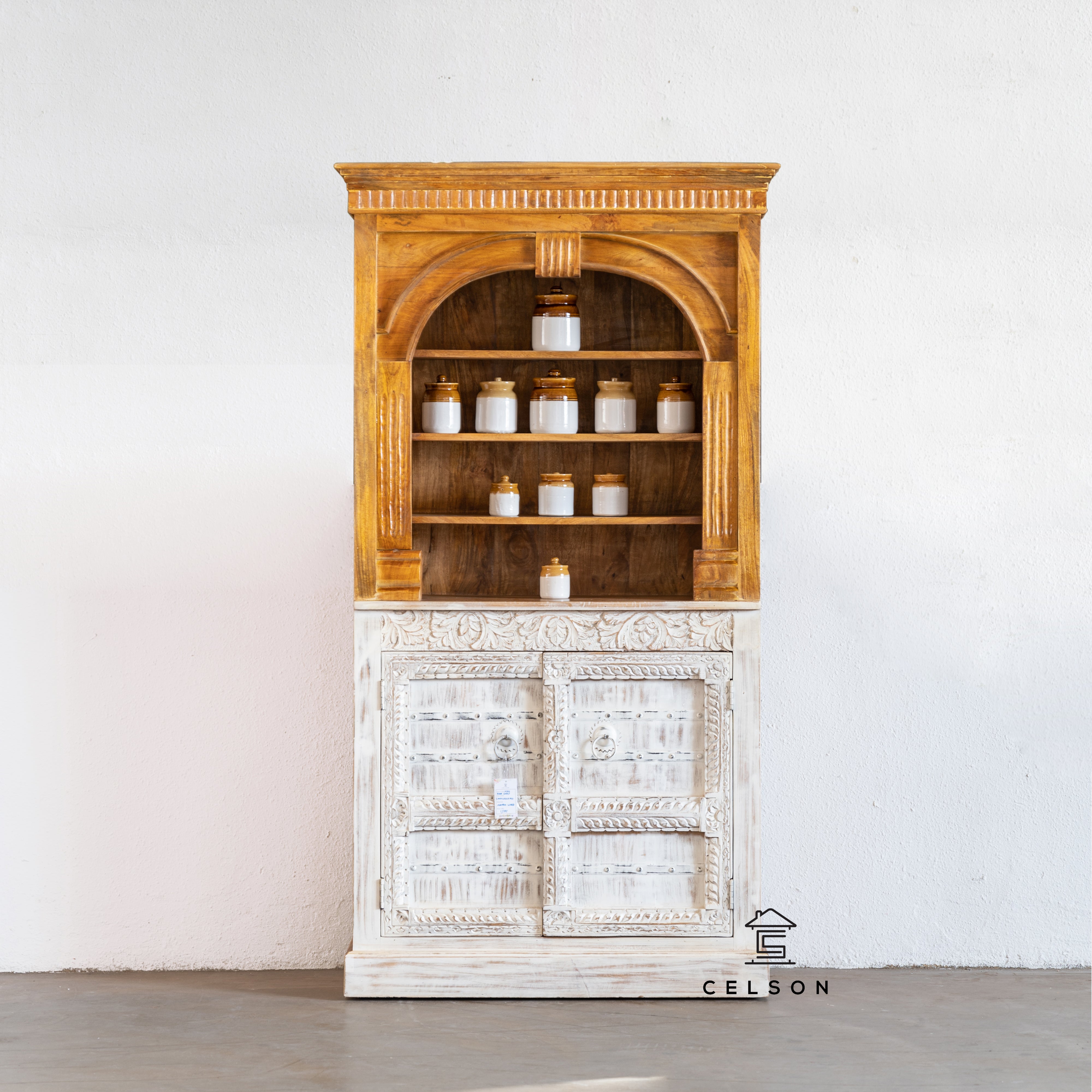 This hand carved tall cabinet would be the perfect addition to your dining area or bedroom! It comes with 2 separate compartments and shelves inside both compartments.