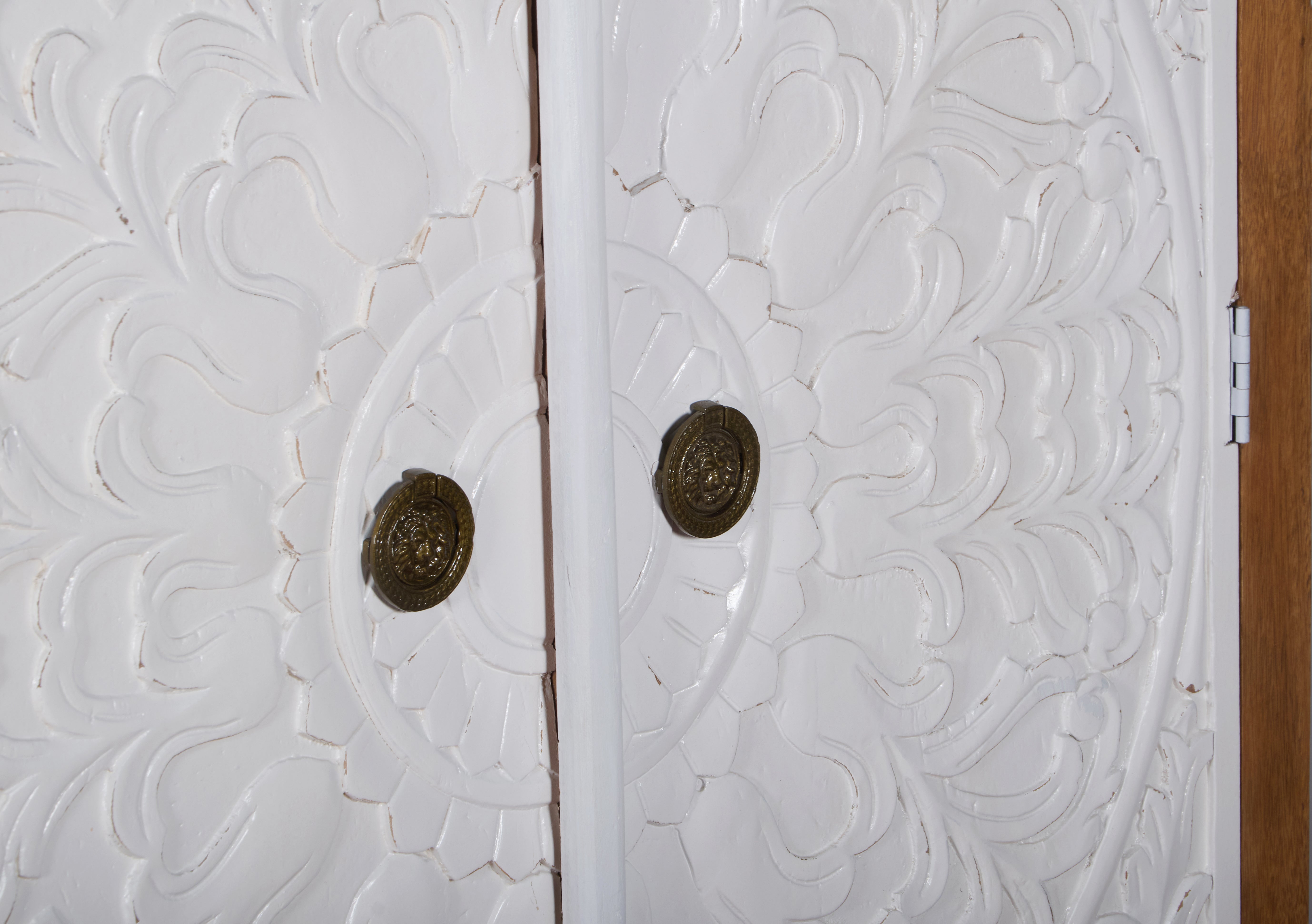 Style meets sturdiness in this solid‑wood bar cabinet - carved doors details, elegant white‑wash tones, and ample storage for your bar‑ware.
