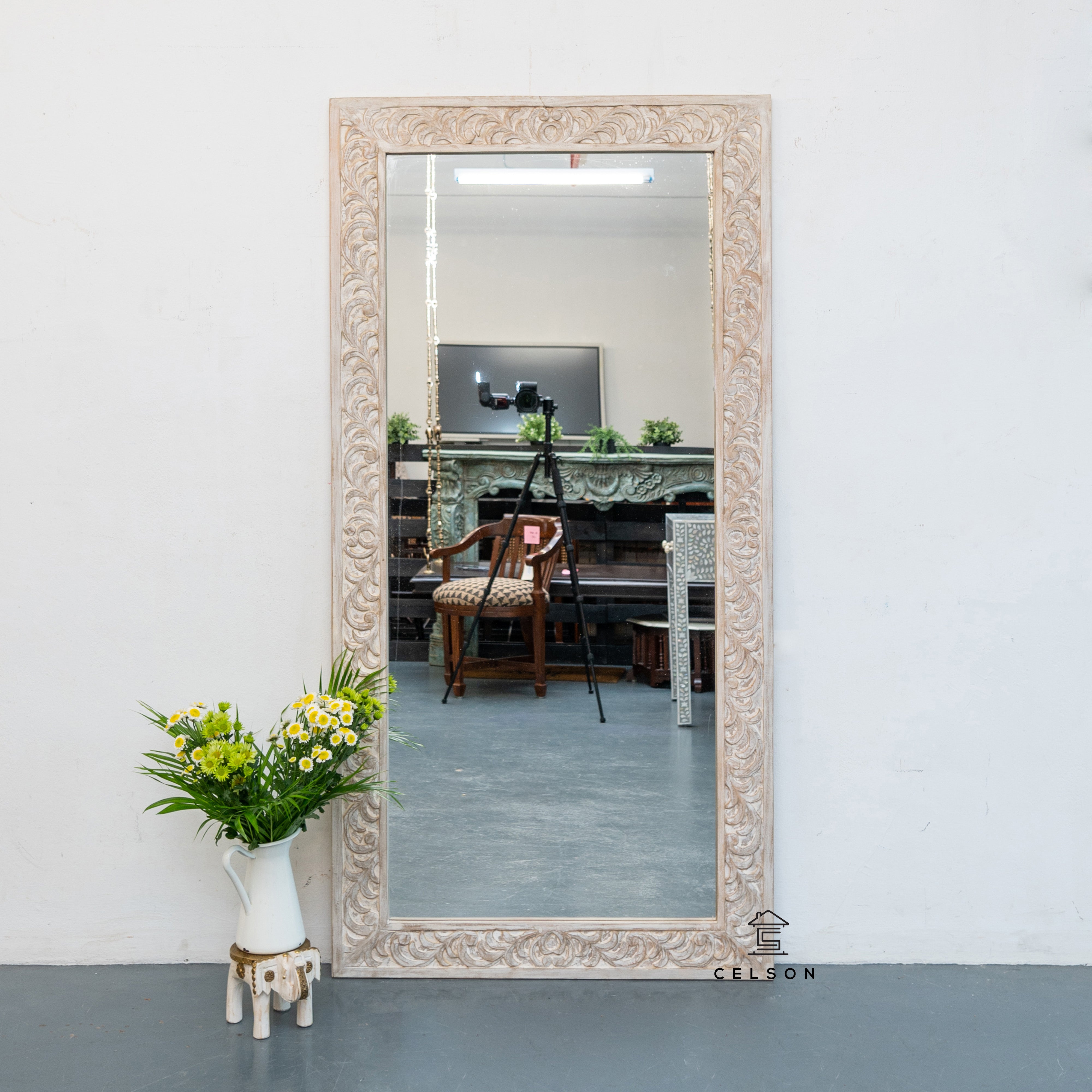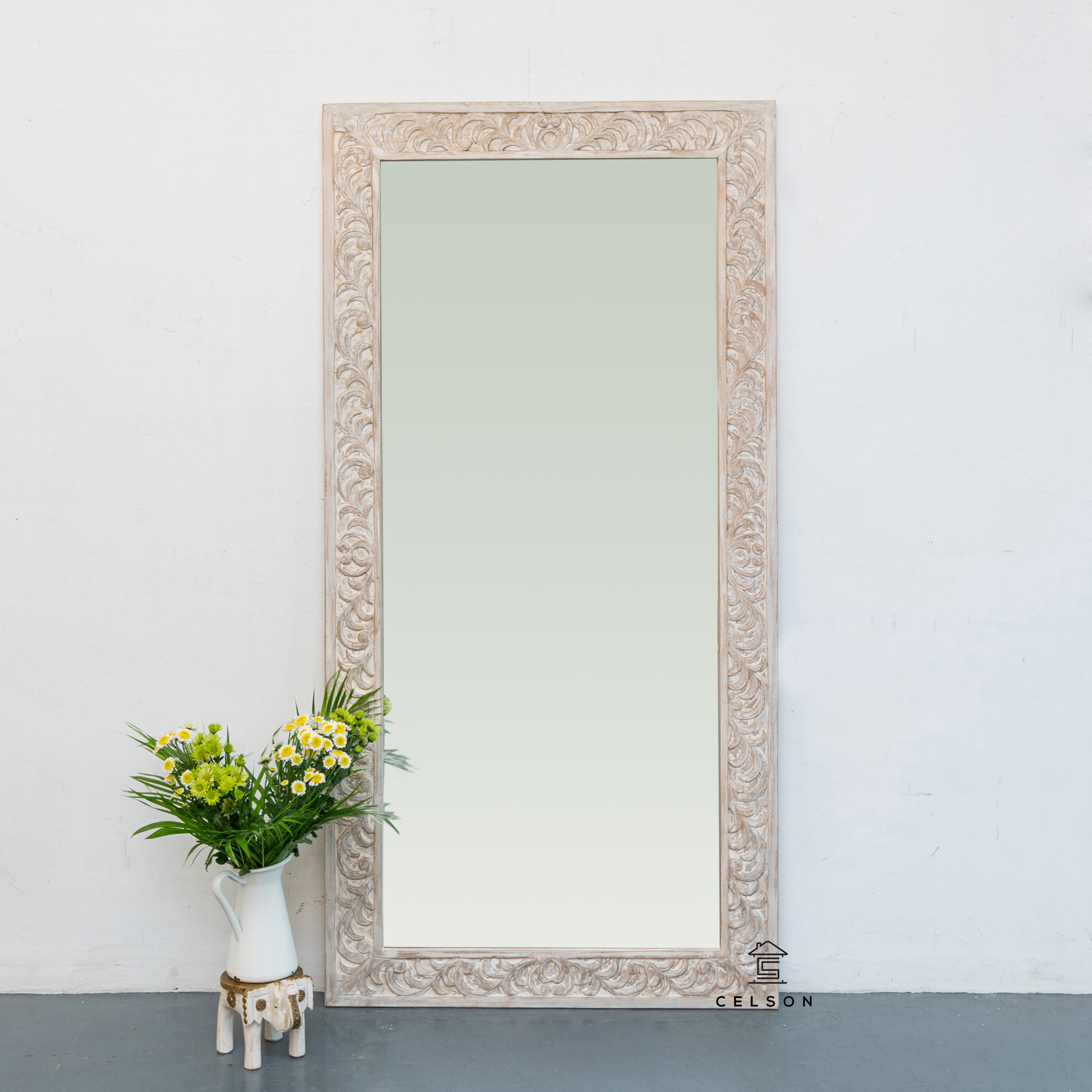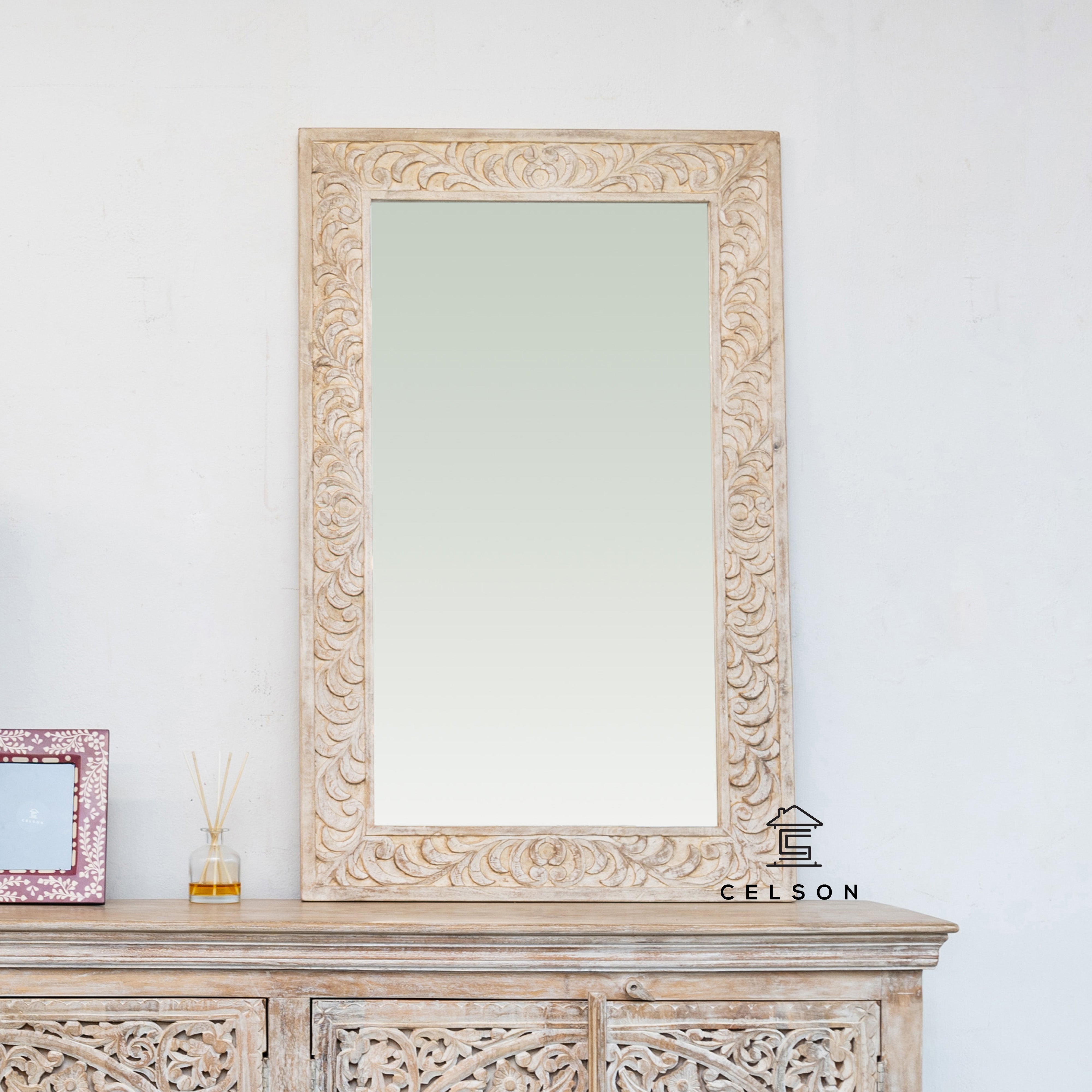 With its hand carved border & a white washed finish, this mirror is an evergreen piece.