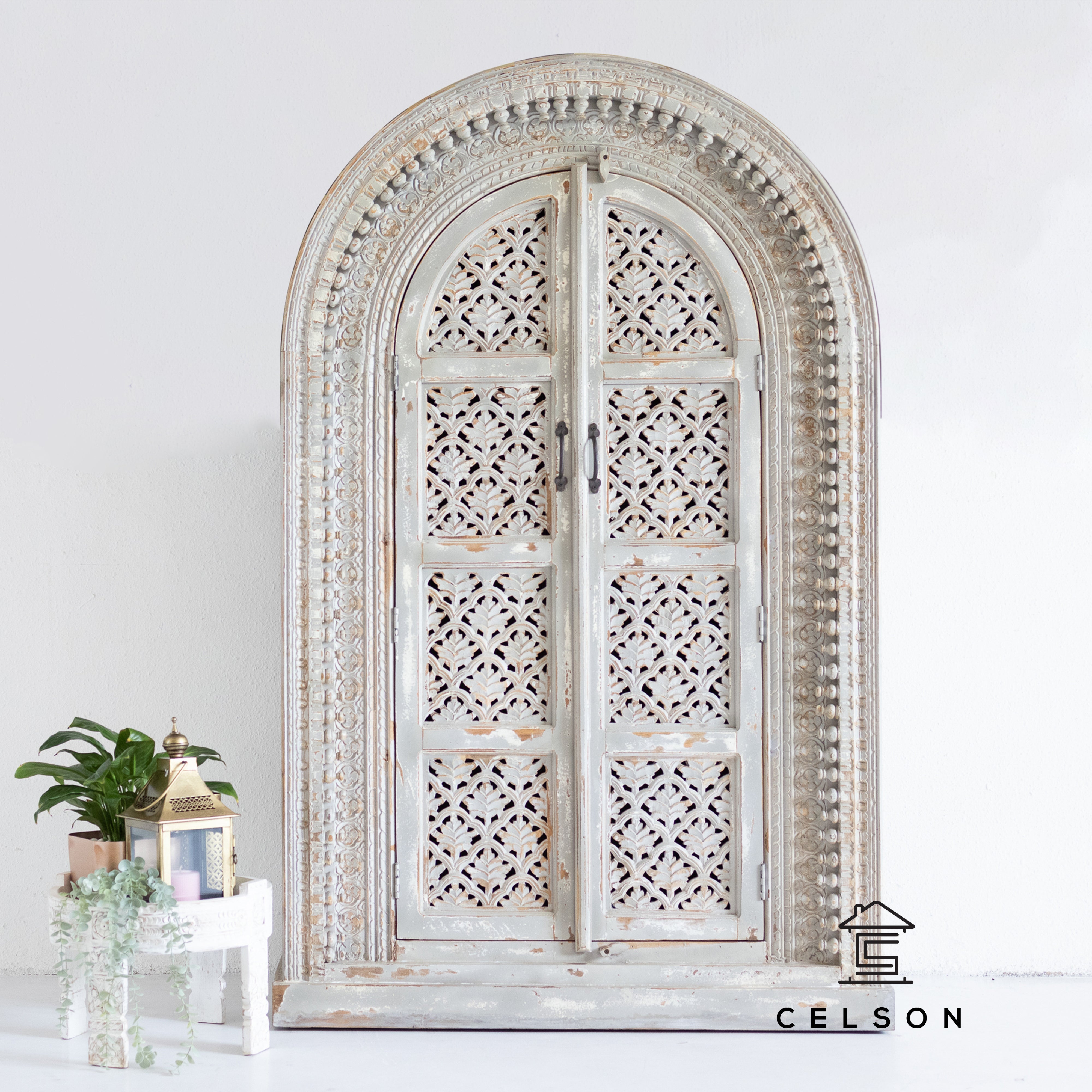 Our hand carved, distressed grey tall cabinet can be a perfect cupboard. It has multiple shelves inside to neatly store all your clothes.
