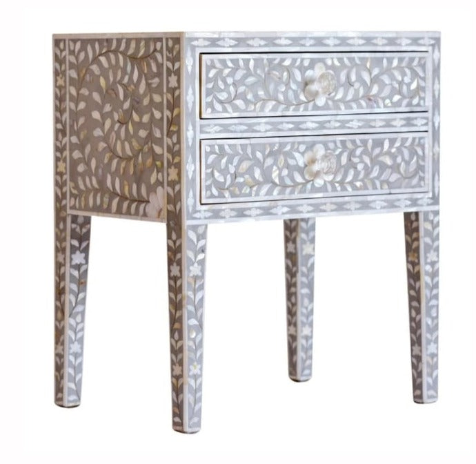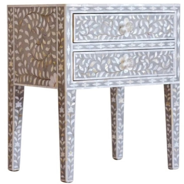 A mother of pearl  bed side table can completely transform the look & feel of any bedroom with its gorgeous pattern & color.