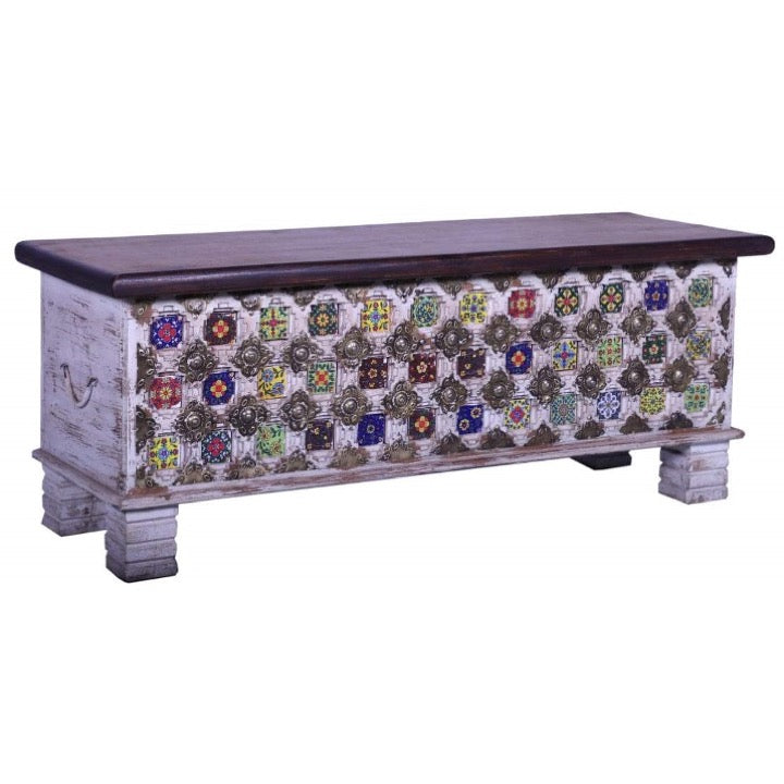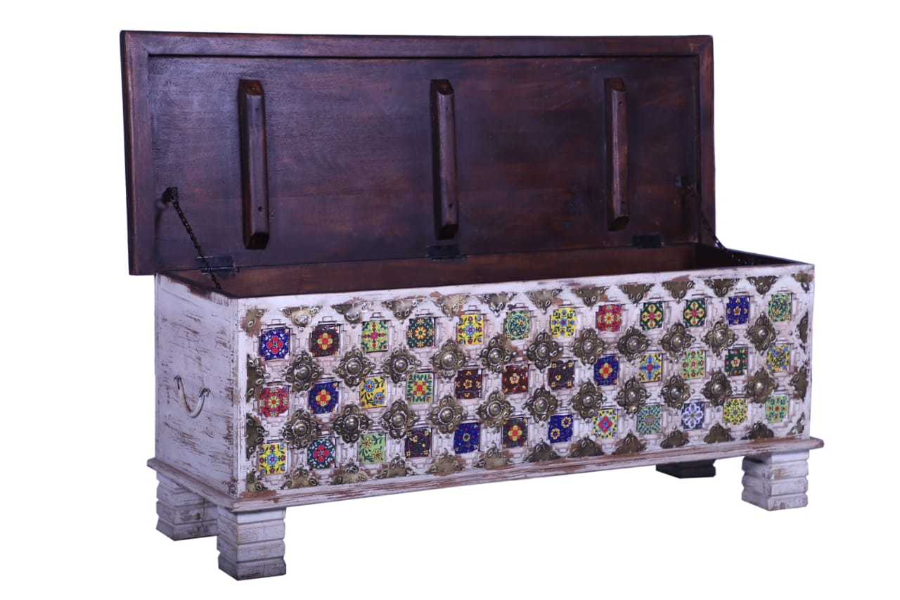 Our Multi colored Tile trunk can be used as an end of the bed bench in bedrooms while holding all your everyday bed linen, quilts and other such items. It also makes for a great coffee table in the common areas of your home with its vintage looks and appeal.