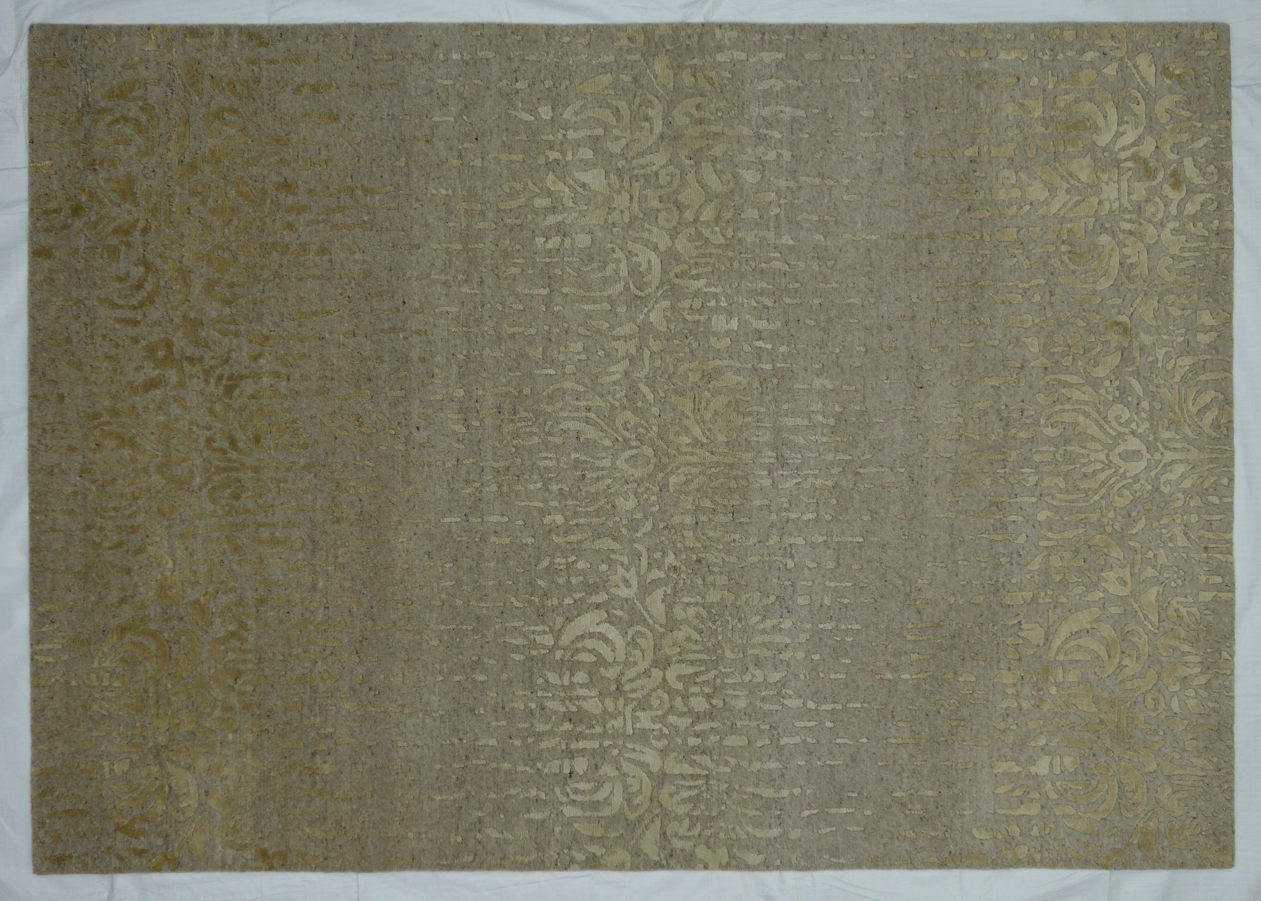 This unique piece features an all-over pattern with a gold design and this modern rug is hand made from viscose and wool fibers. High quality wool creates a unique and lush texture and feel.