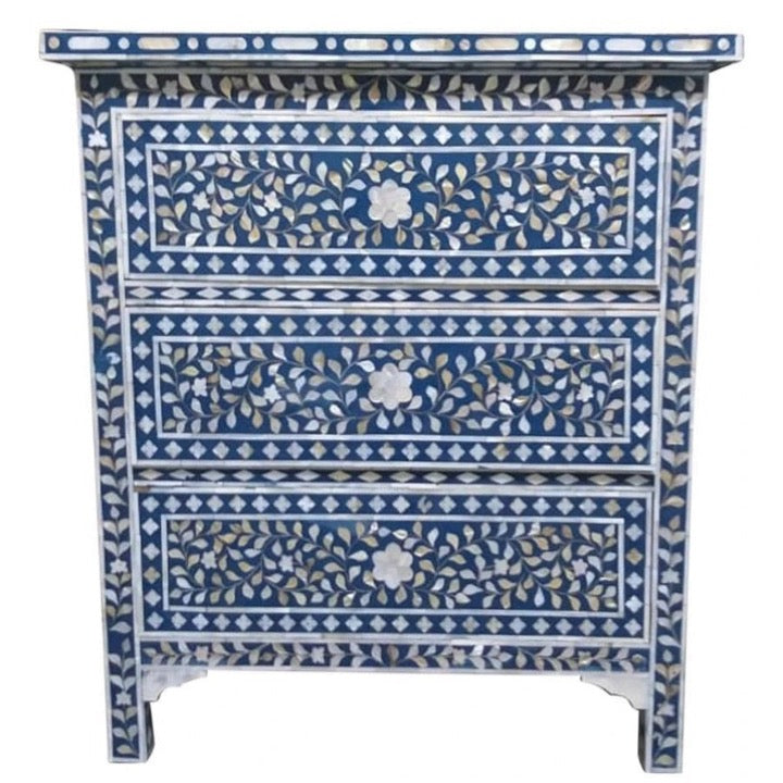 A mother of pearl inlay bed side table can completely transform the look & feel of any bedroom with its gorgeous pattern & color. This one here is a masterpiece with its floral pattern set in blue color & floral knobs to match.