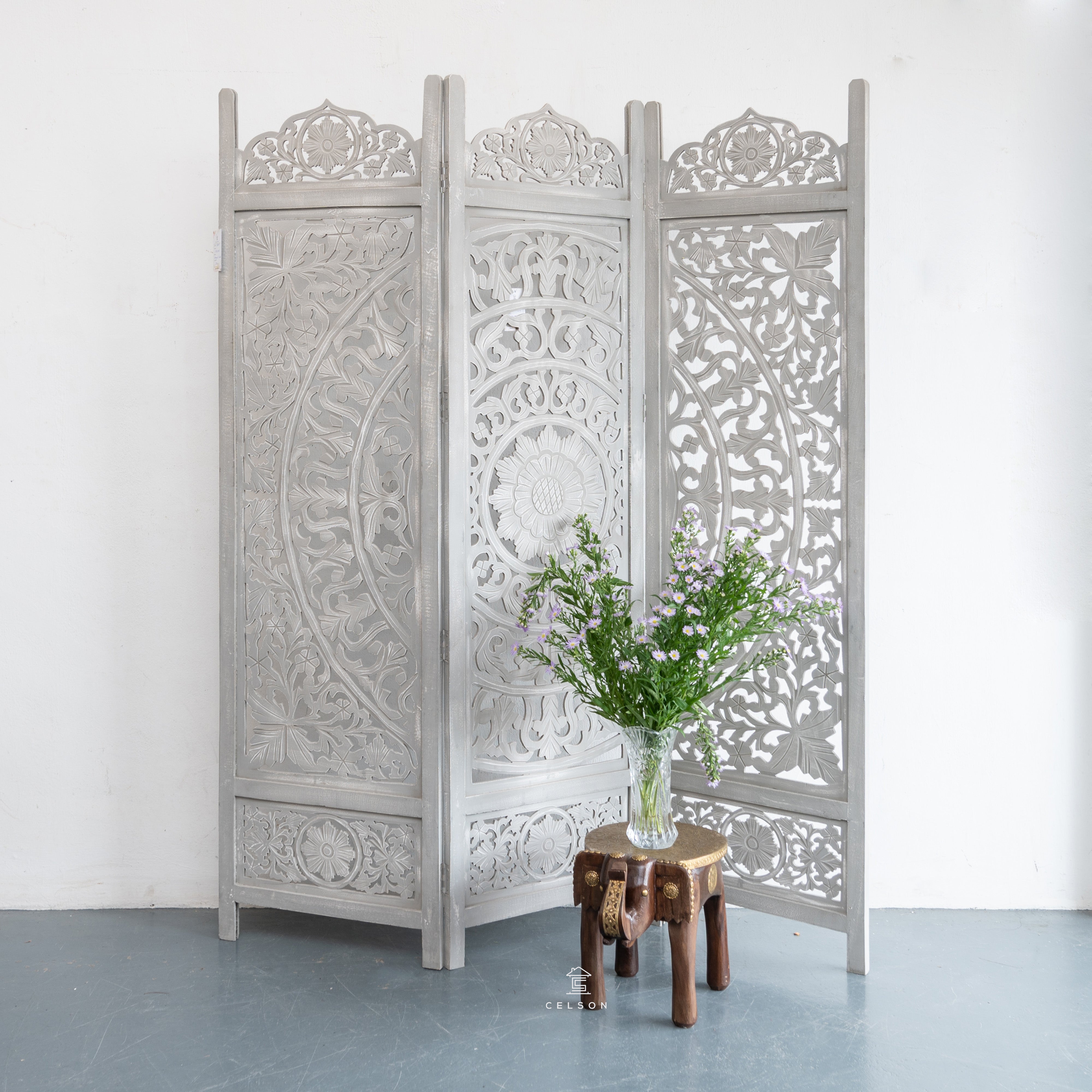 This gorgeous  floral pattern screen comes in grey finish with 3 panels.