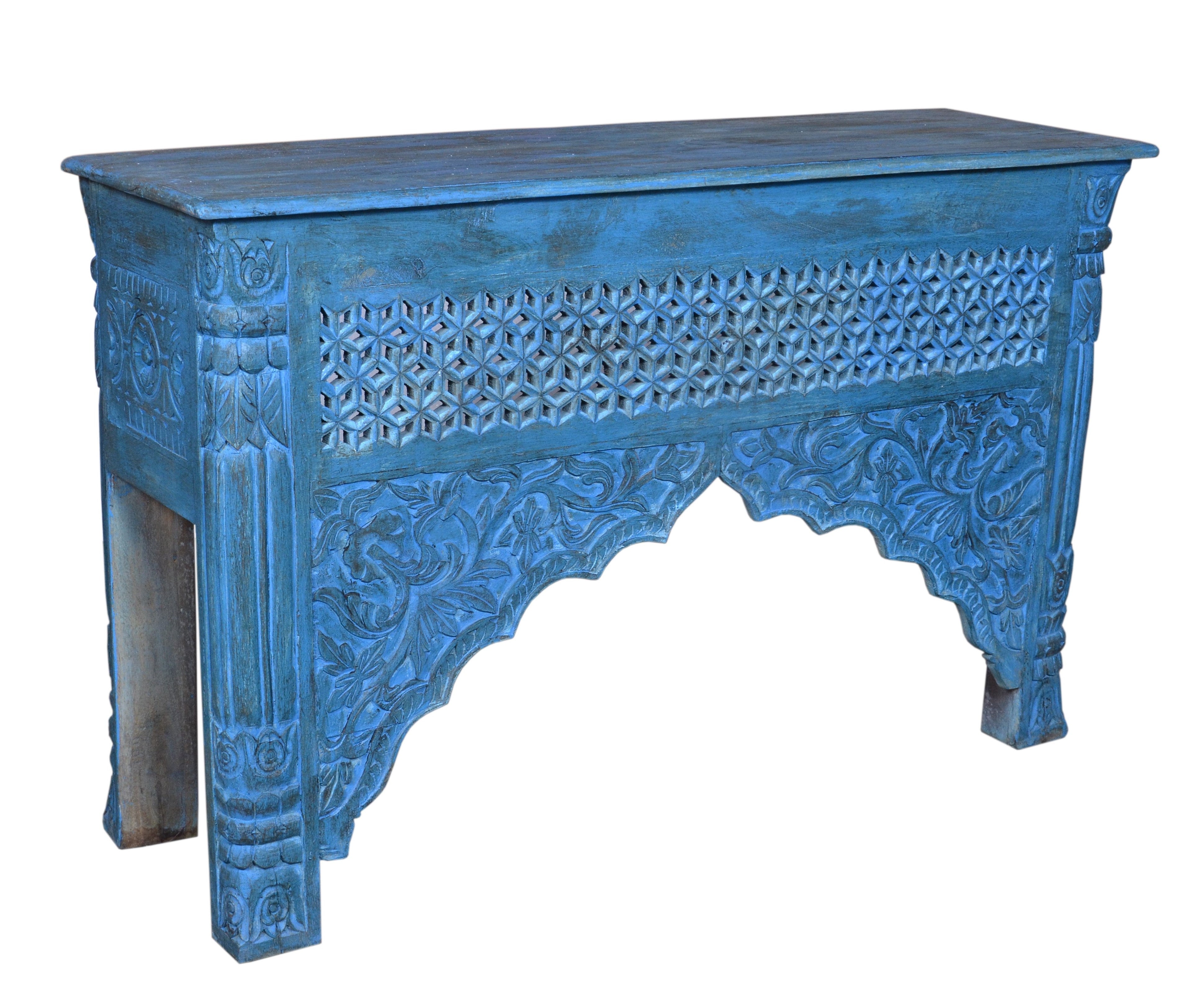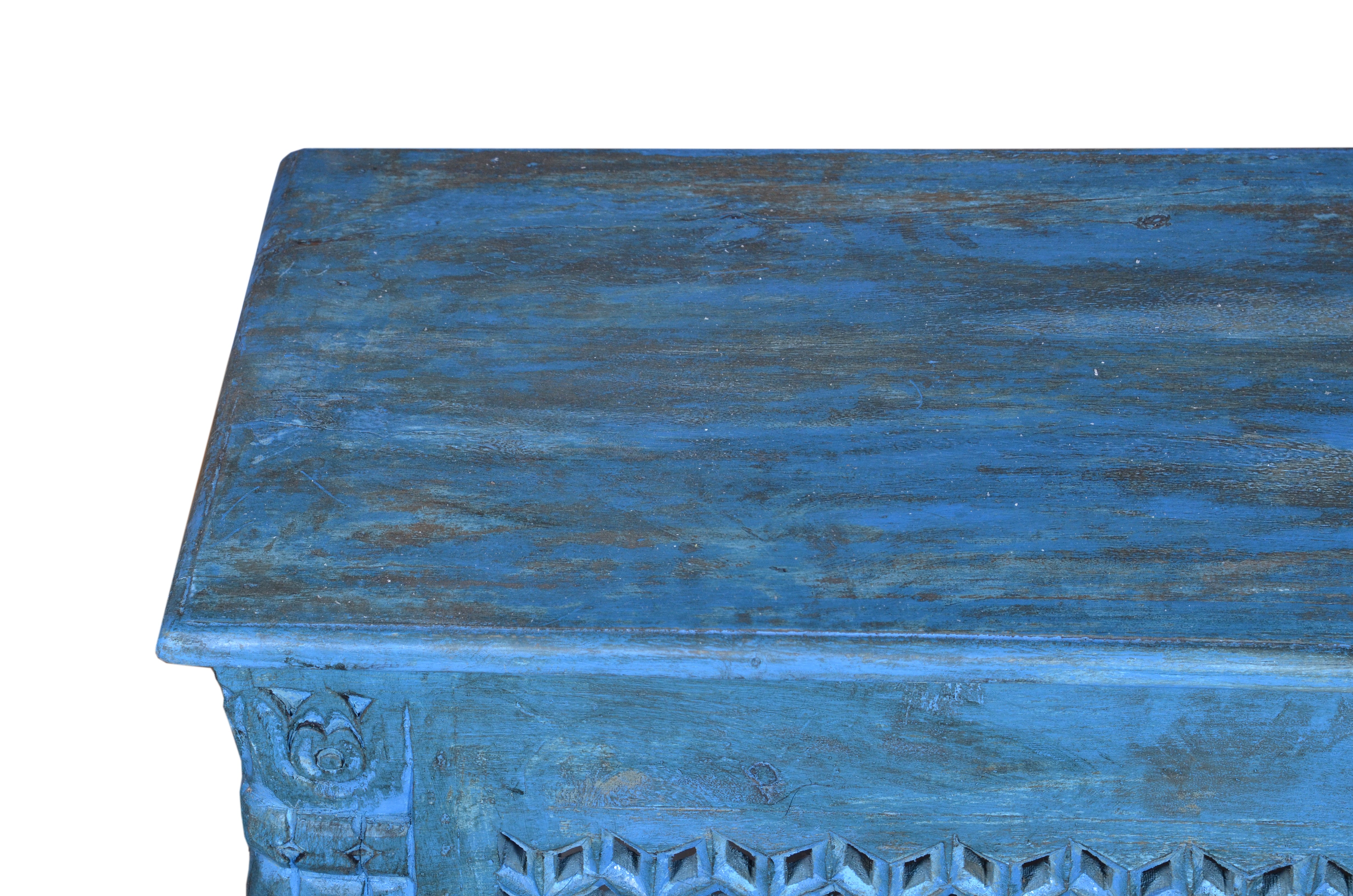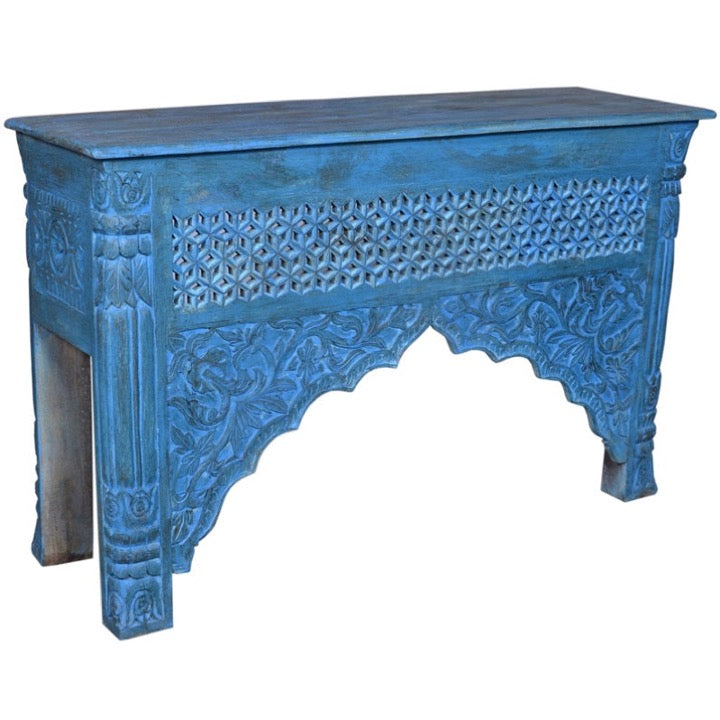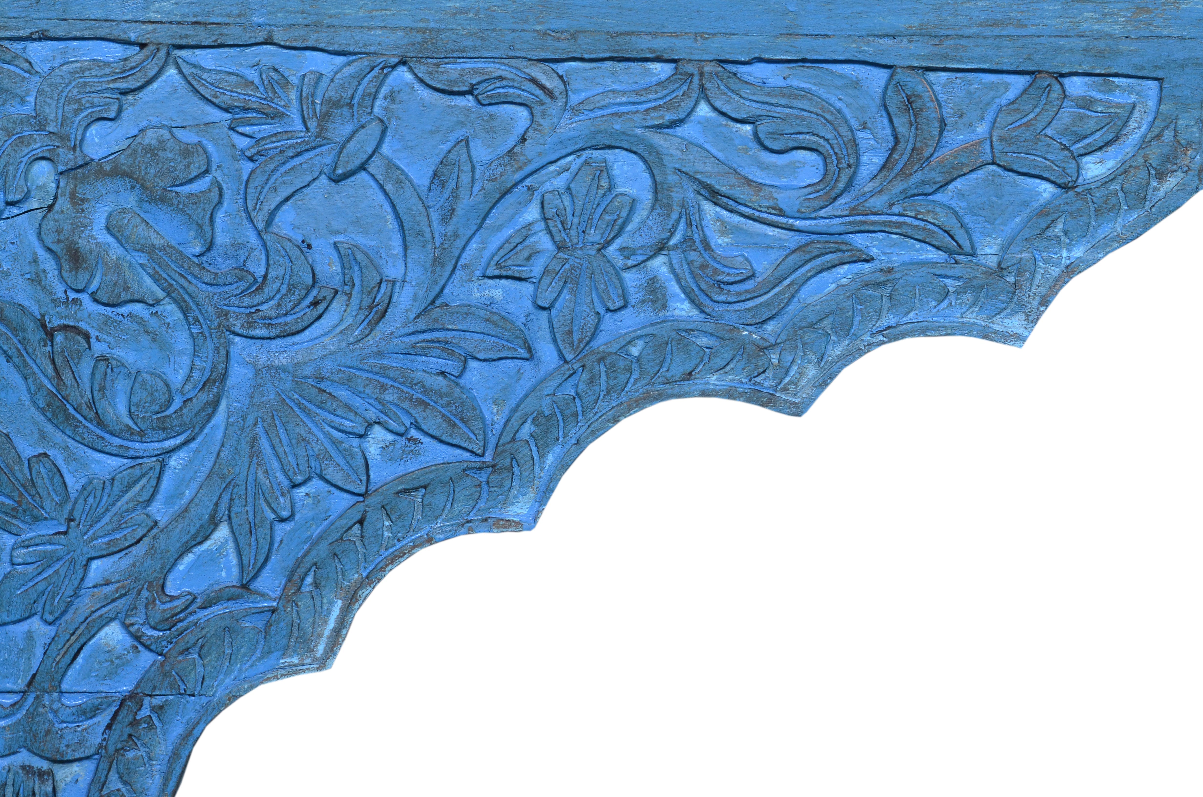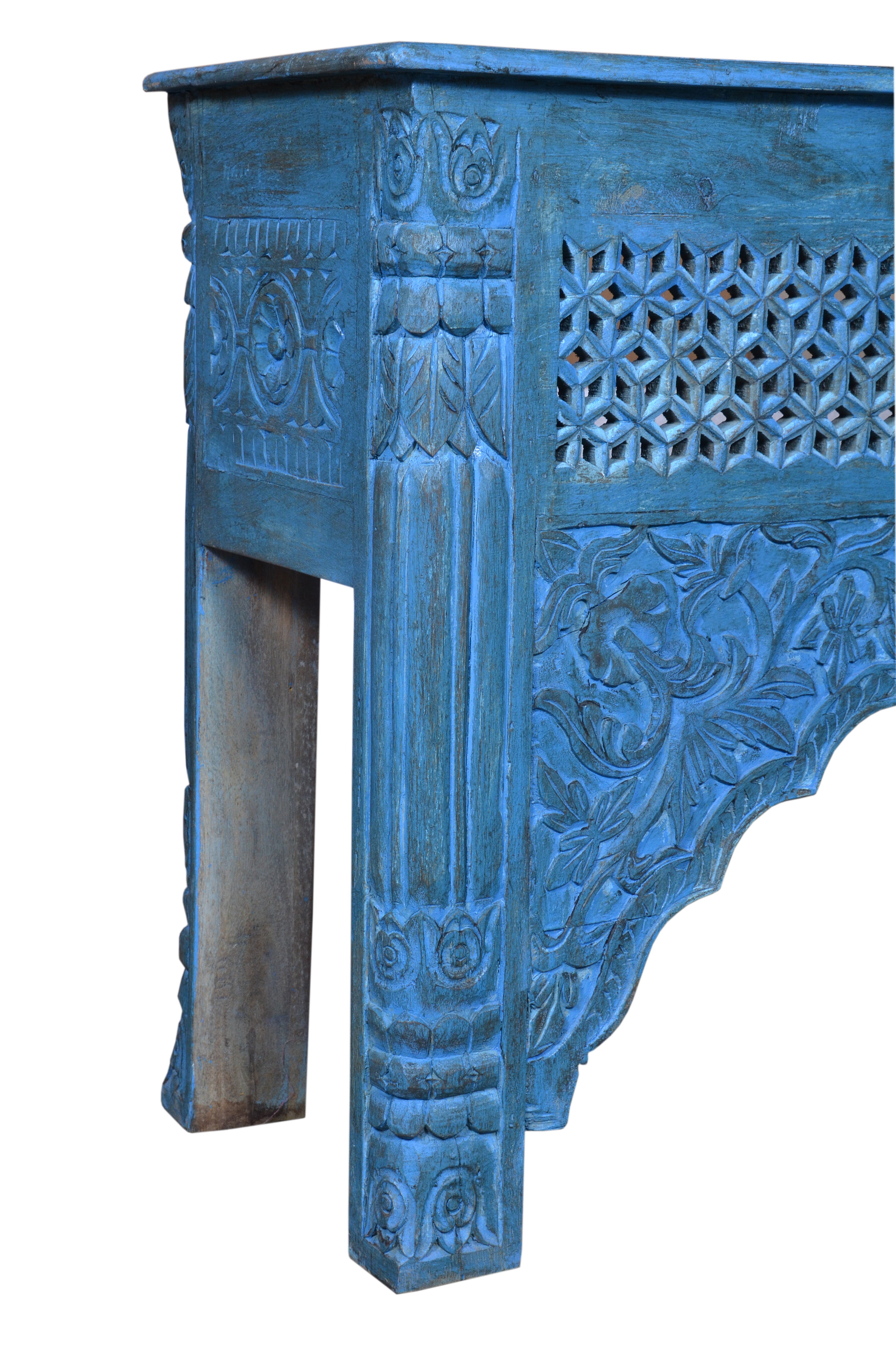 It comes with a hand carved front facade in a distressed blue finish which gives it a vintage look & feel.