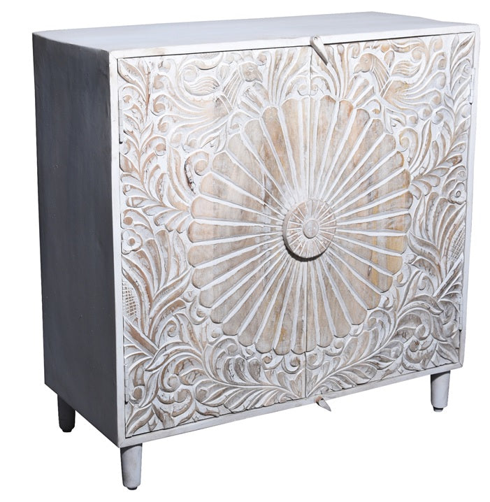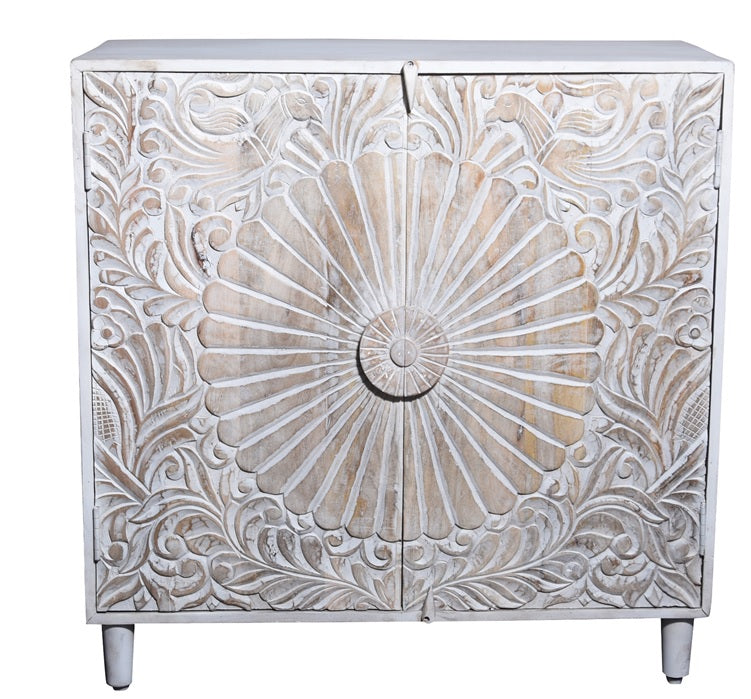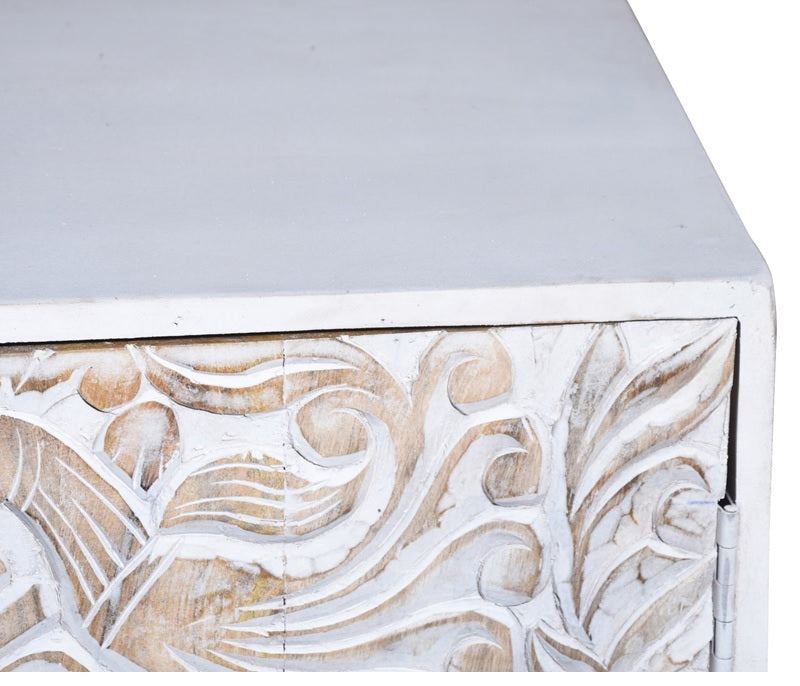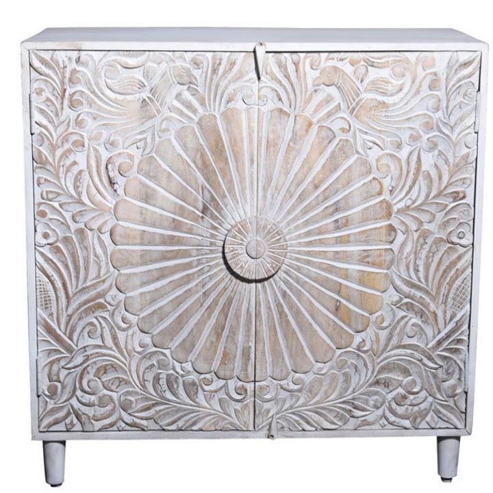 This hand carved white washed chest definitely makes it to the top of our favorite pieces list! Along with looking stunning it also provides a good amount of storage space with its floral design.