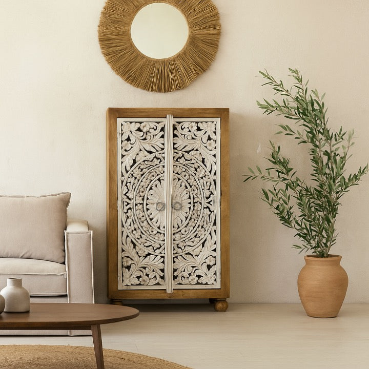 Our Henry almirah, having sturdy mango wood construction with beautiful natural and white washed finish works perfectly with the color scheme of any bedroom, living room, and hallway or entryway.