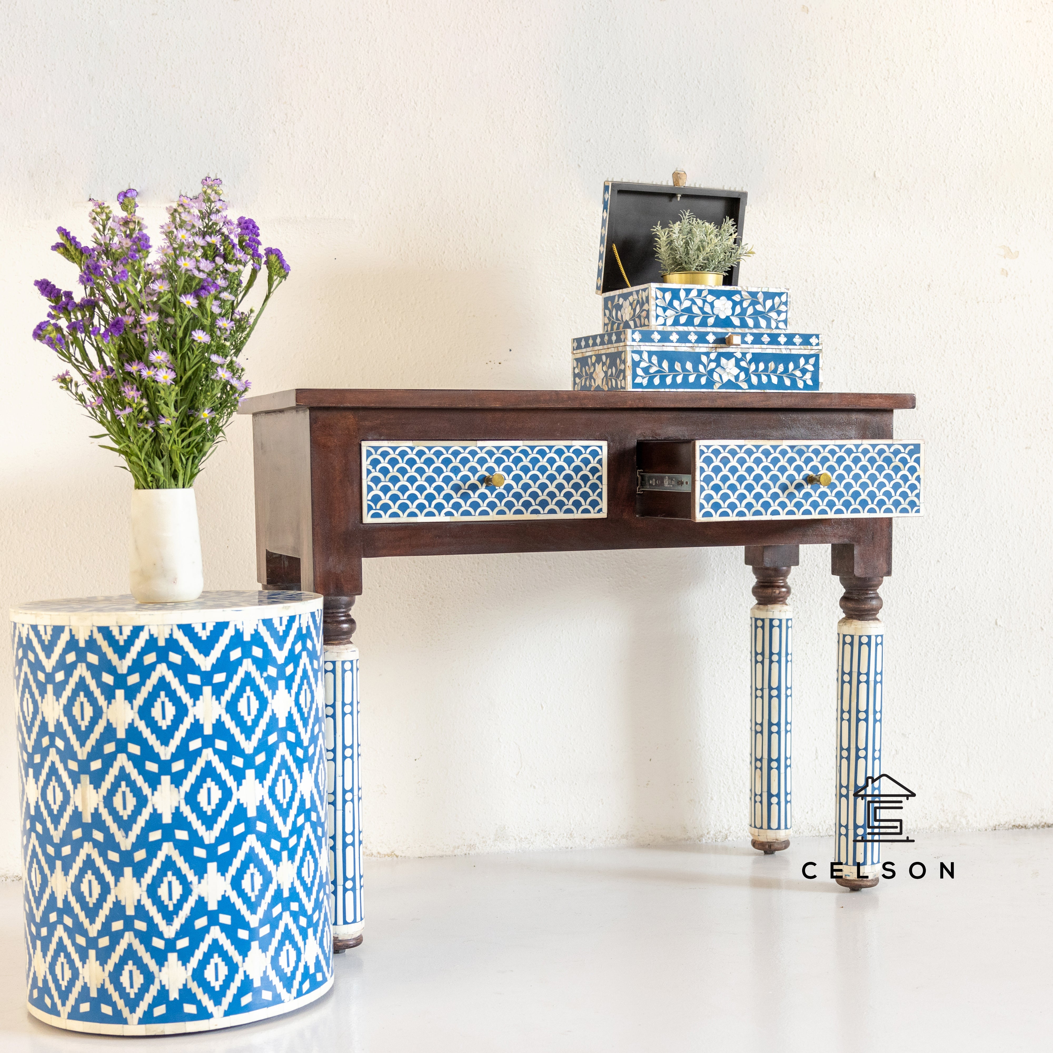 This bone inlay console table is sure to catch your eye! Features 2 drawers and stylish hardware to complete the look.