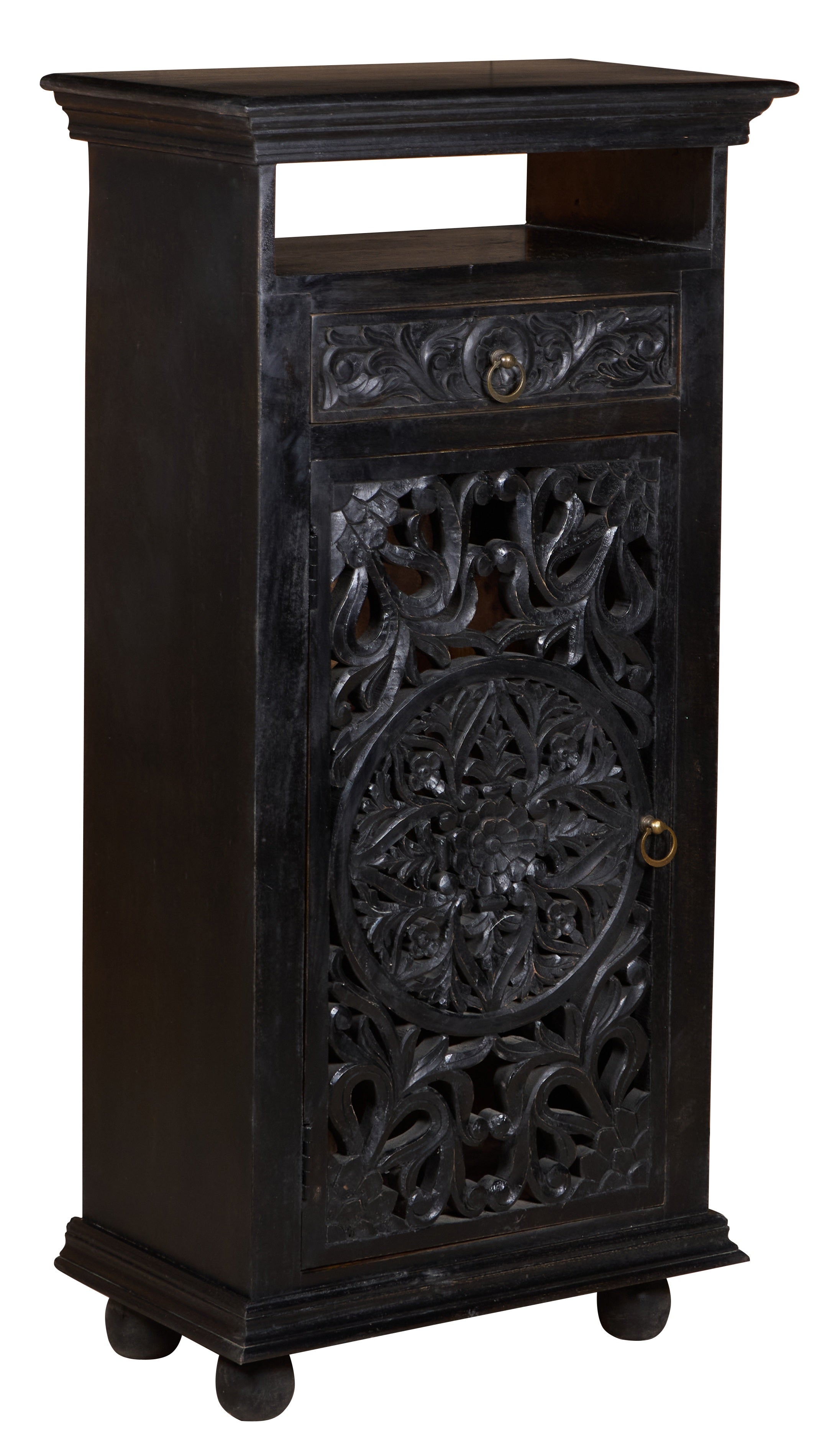 Make a bold statement with this black hand-carved tall cabinet!  Inspired by traditional Indian craftsmanship, this stunning chest combines intricate detailing with modern elegance. Perfect for adding both storage and style to any room.