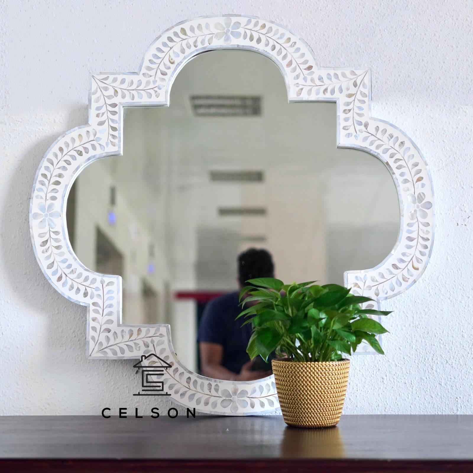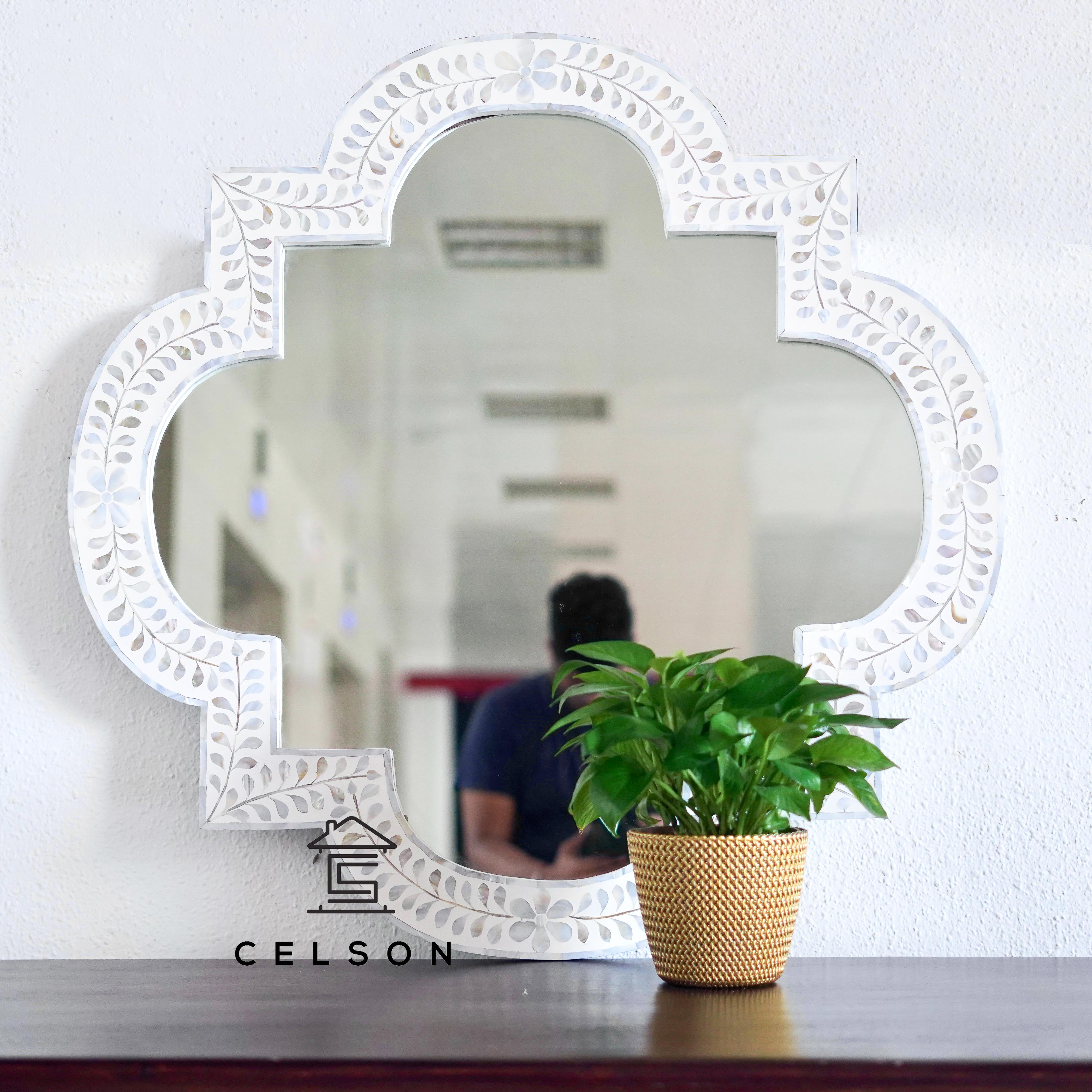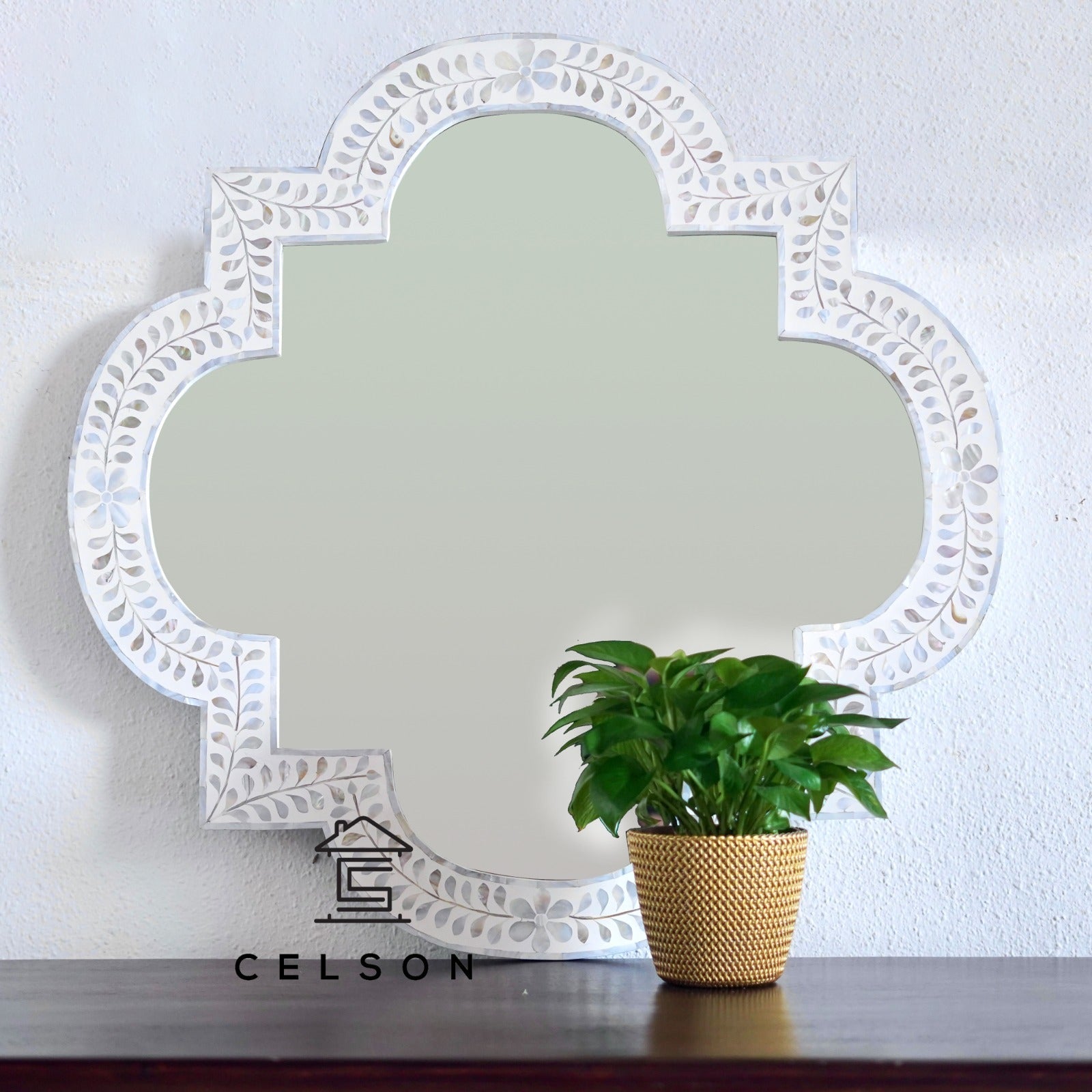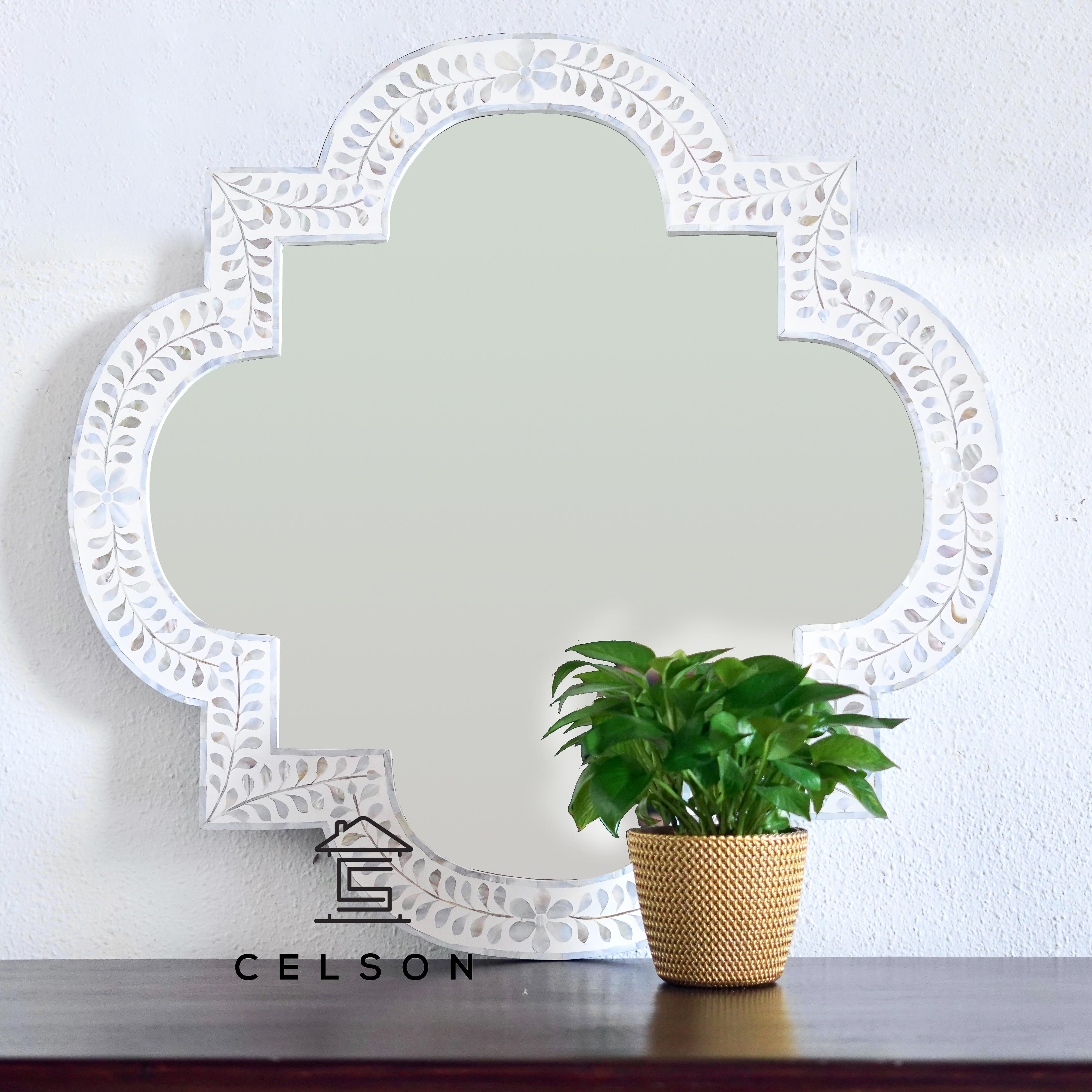 Sometimes, all it takes is the perfect piece to elevate a space. This Mother of Pearl Inlay Mirror Frame, with its unique shape, is all you need to transform a plain wall into a statement of simplicity, elegance, and taste.