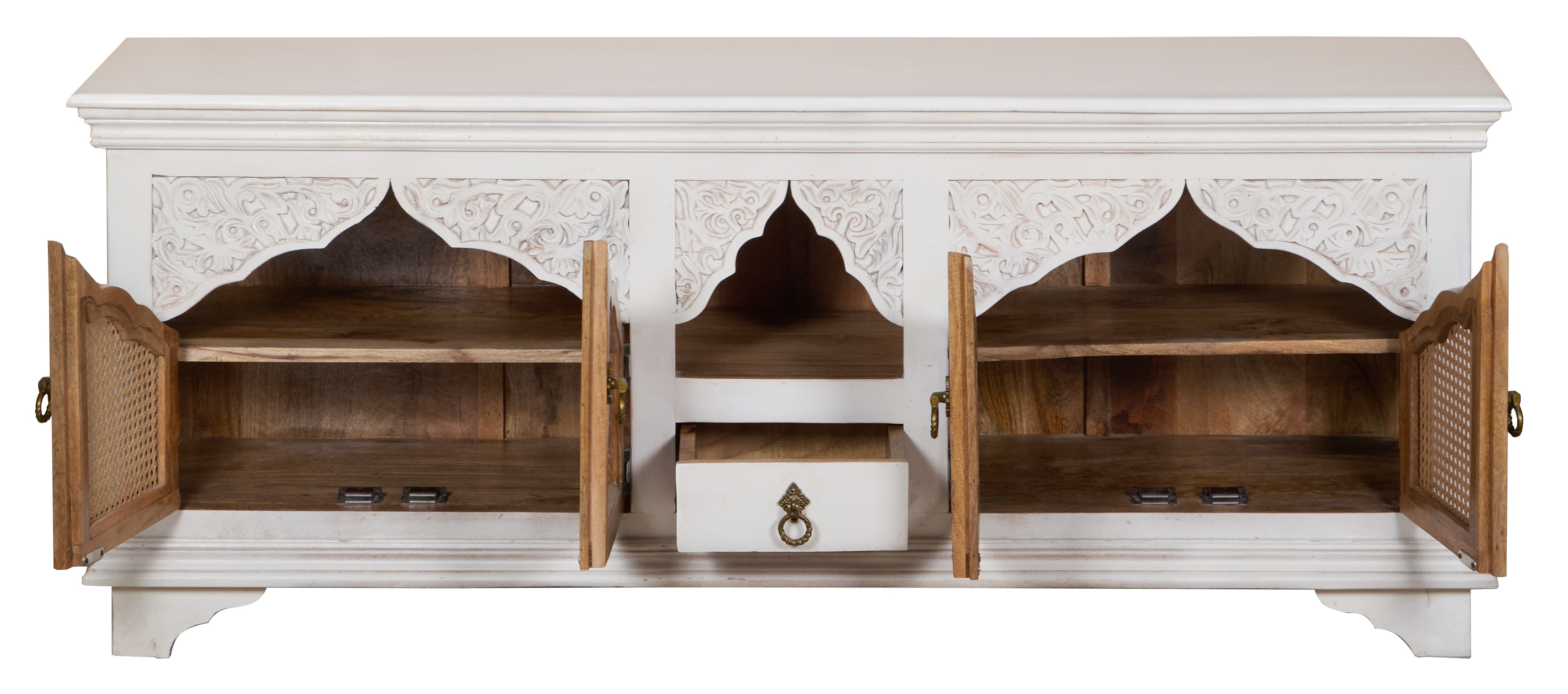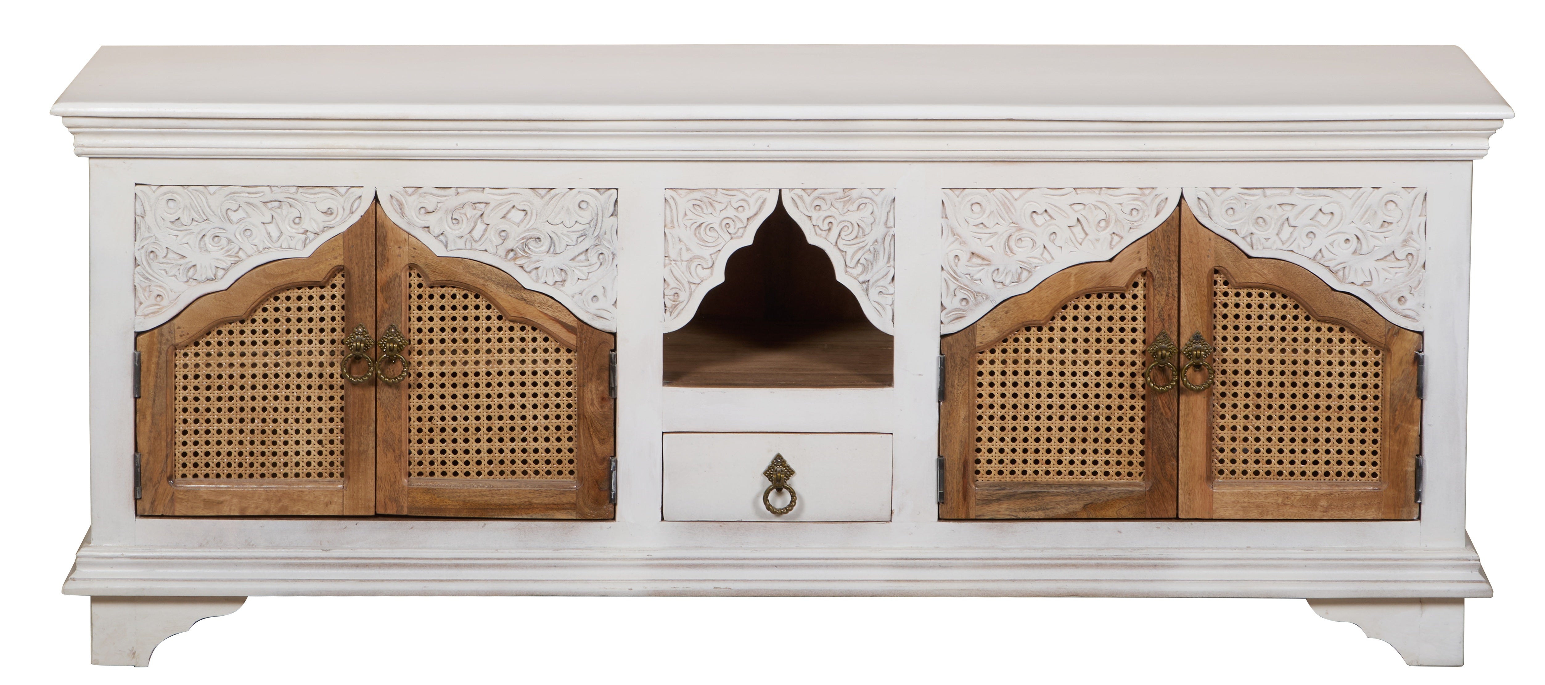 A touch of heritage: Hand-carved TV console with brown rattan doors, adding a rich, artisanal feel to your living space.