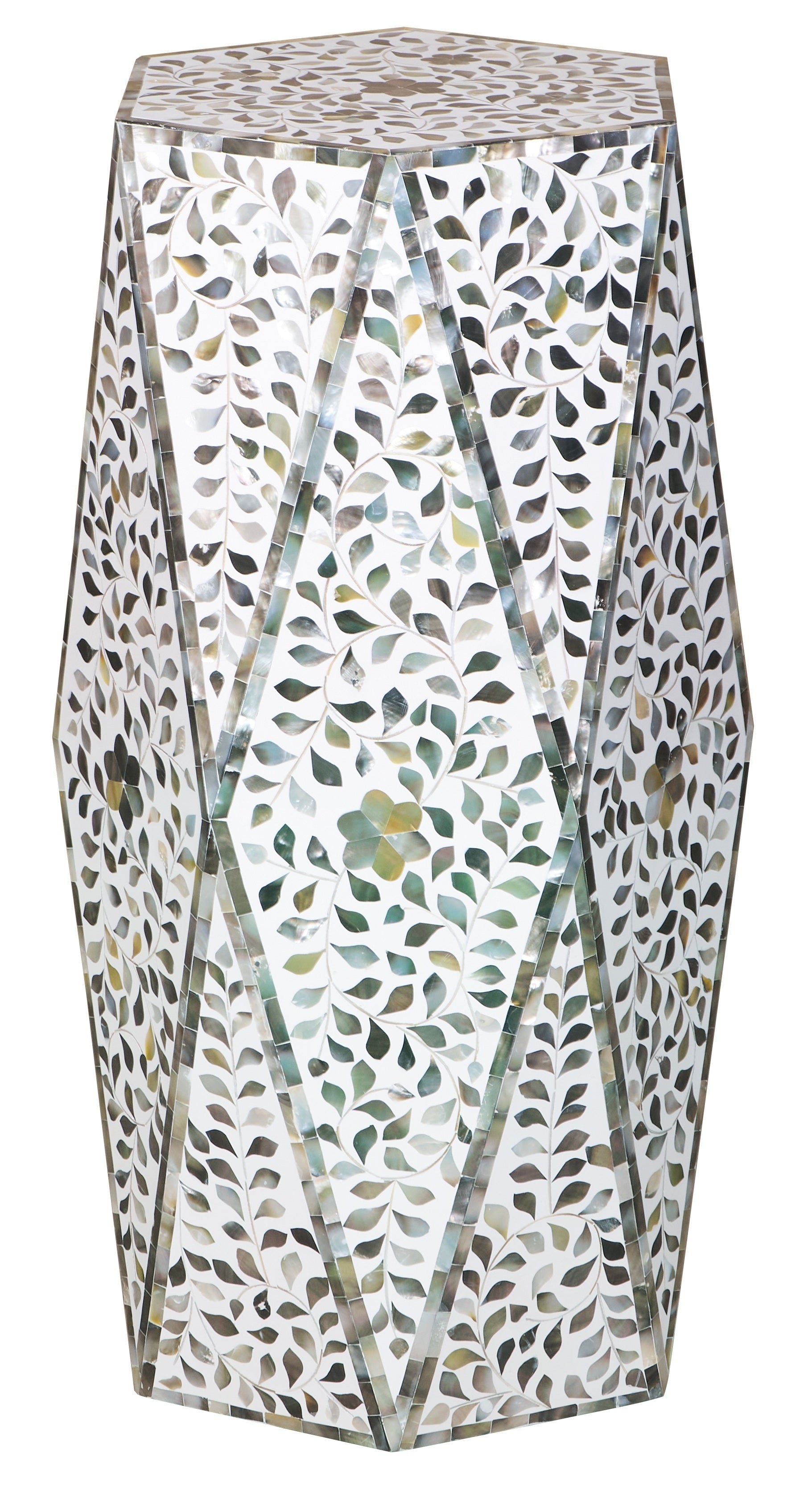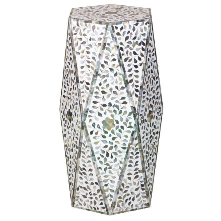 This Mother of Pearl Inlay side stool works beautifully as a planter, bedside table, or side table, bringing elegance to any corner.