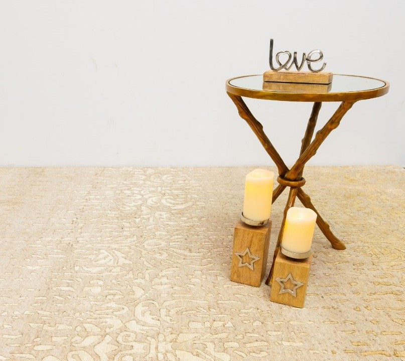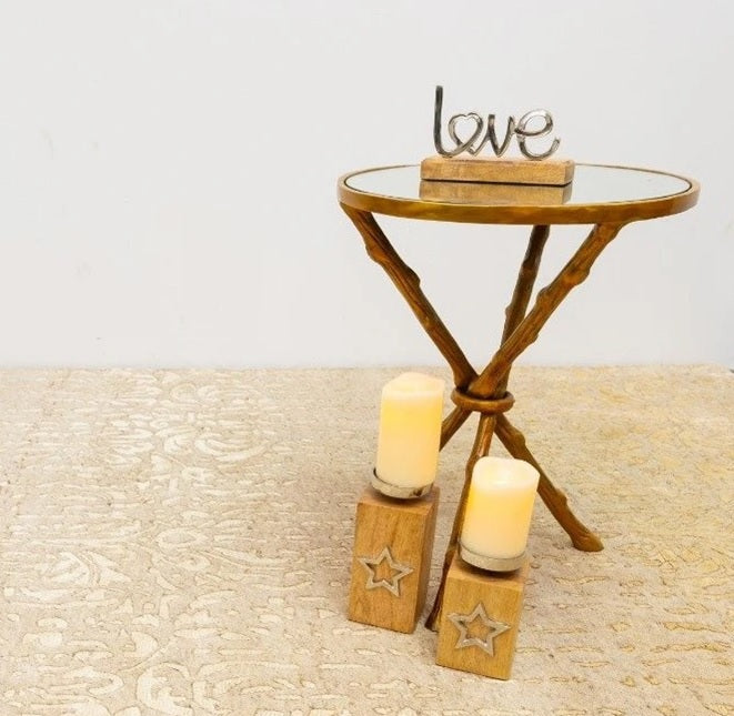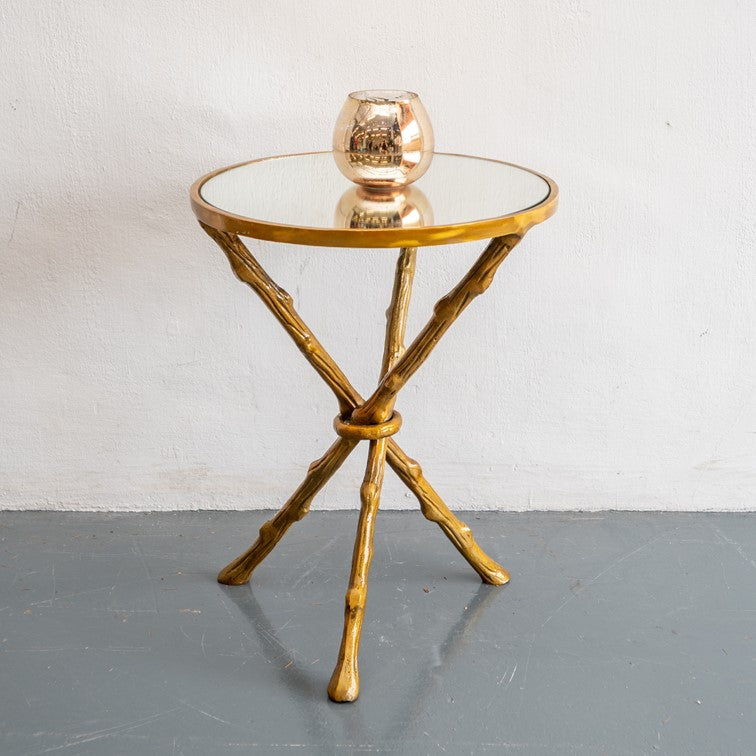The Gold Leaf Branches Round Accent Table adds natural inspiration to your decor. Complete with a round mirror top, aluminum body frame, and a brass antique finish, this three cross leg accent table is a charming addition for any living space.