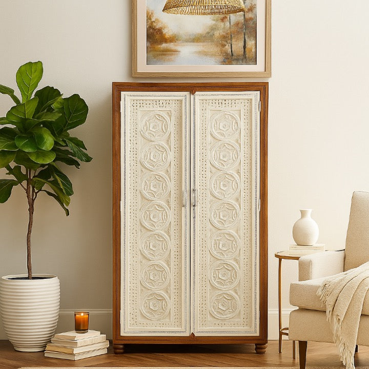 With a lovely white wash & brown finish, fully hand carved doors & complimenting pulls, this piece is a keeper!