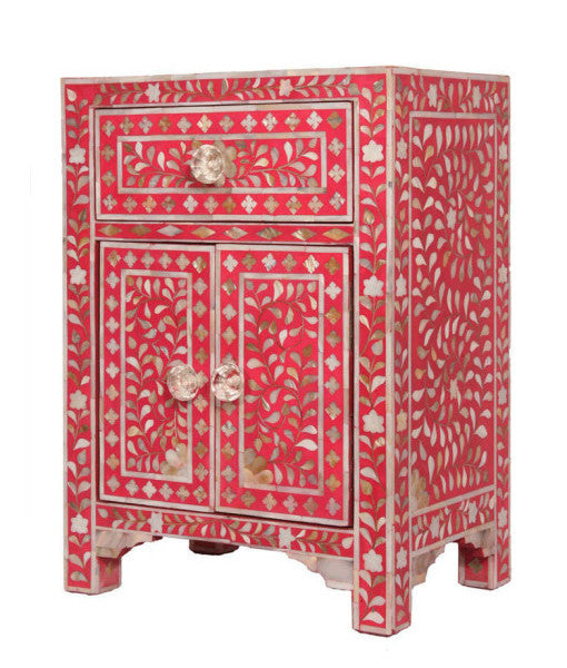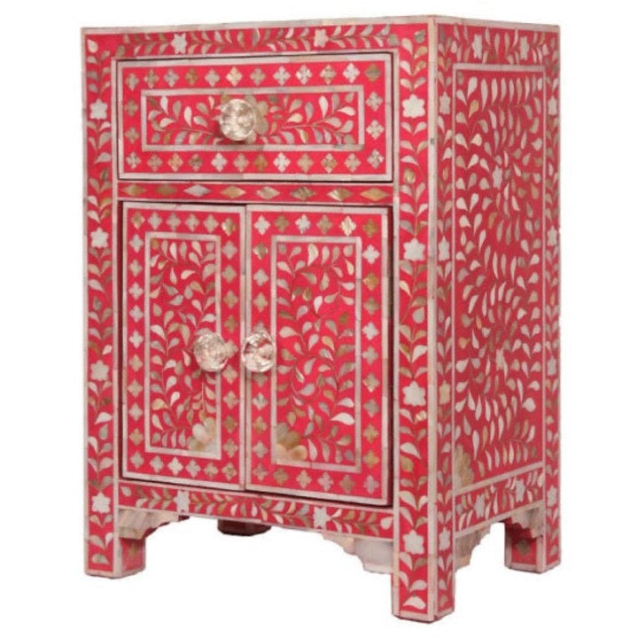 Our Mother of pearl inlay bed side tables not only look gorgeous but are super practical too! They have a drawer on top for your absolute bed time essentials and a bigger compartment with two doors below the drawer to hold other items.