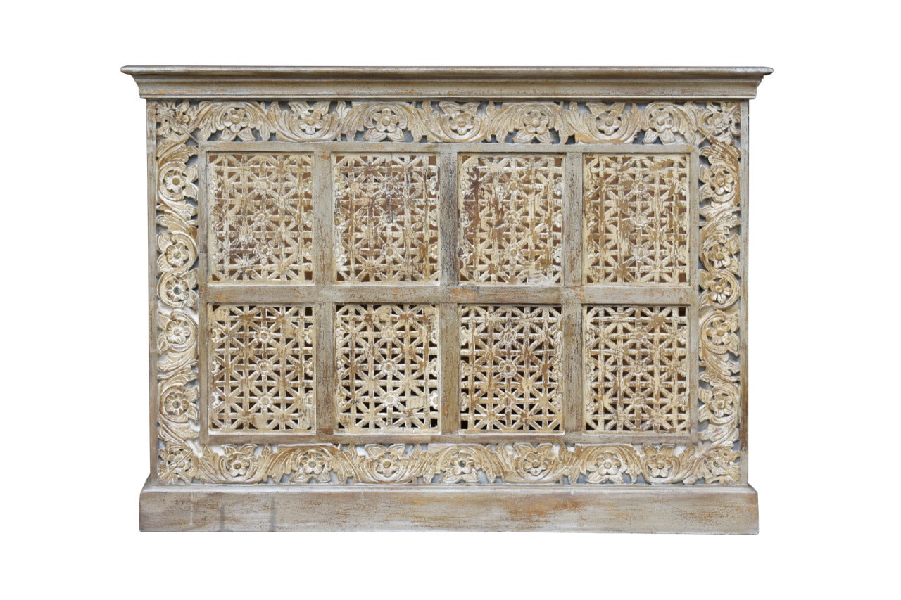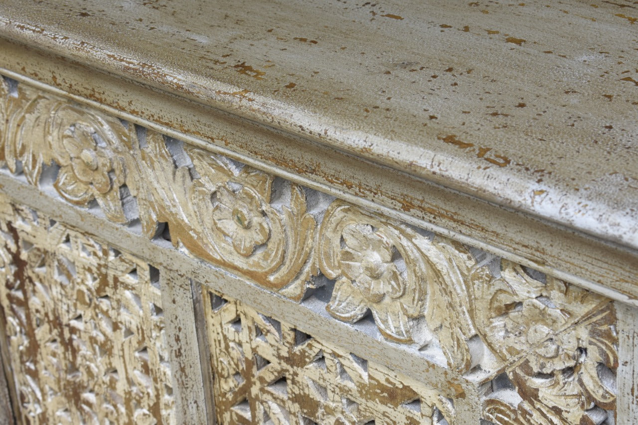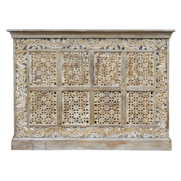 And this one is sure to make heads turn with its carving exterior & distress finish. It also contains 2 large shelves and 4 drawers to comfortably house all your bottles & glasses.