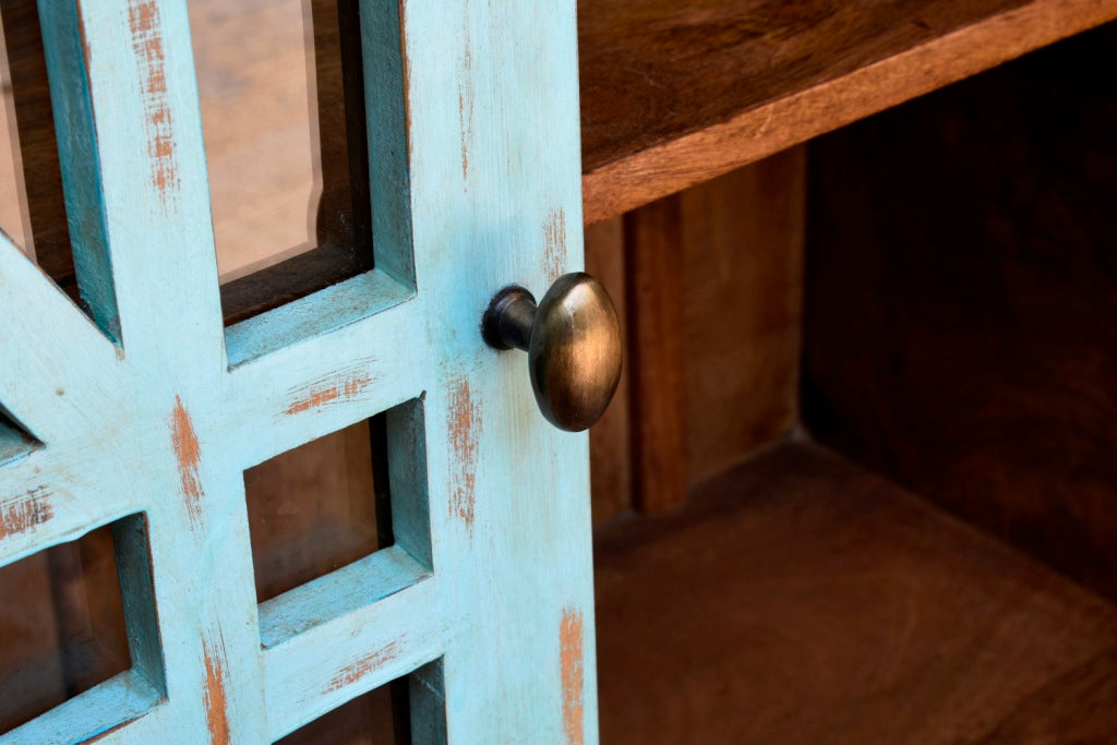 With glass on its front panel & a geometrical design, this one’s perfect for young couples who love to host parties and guests!