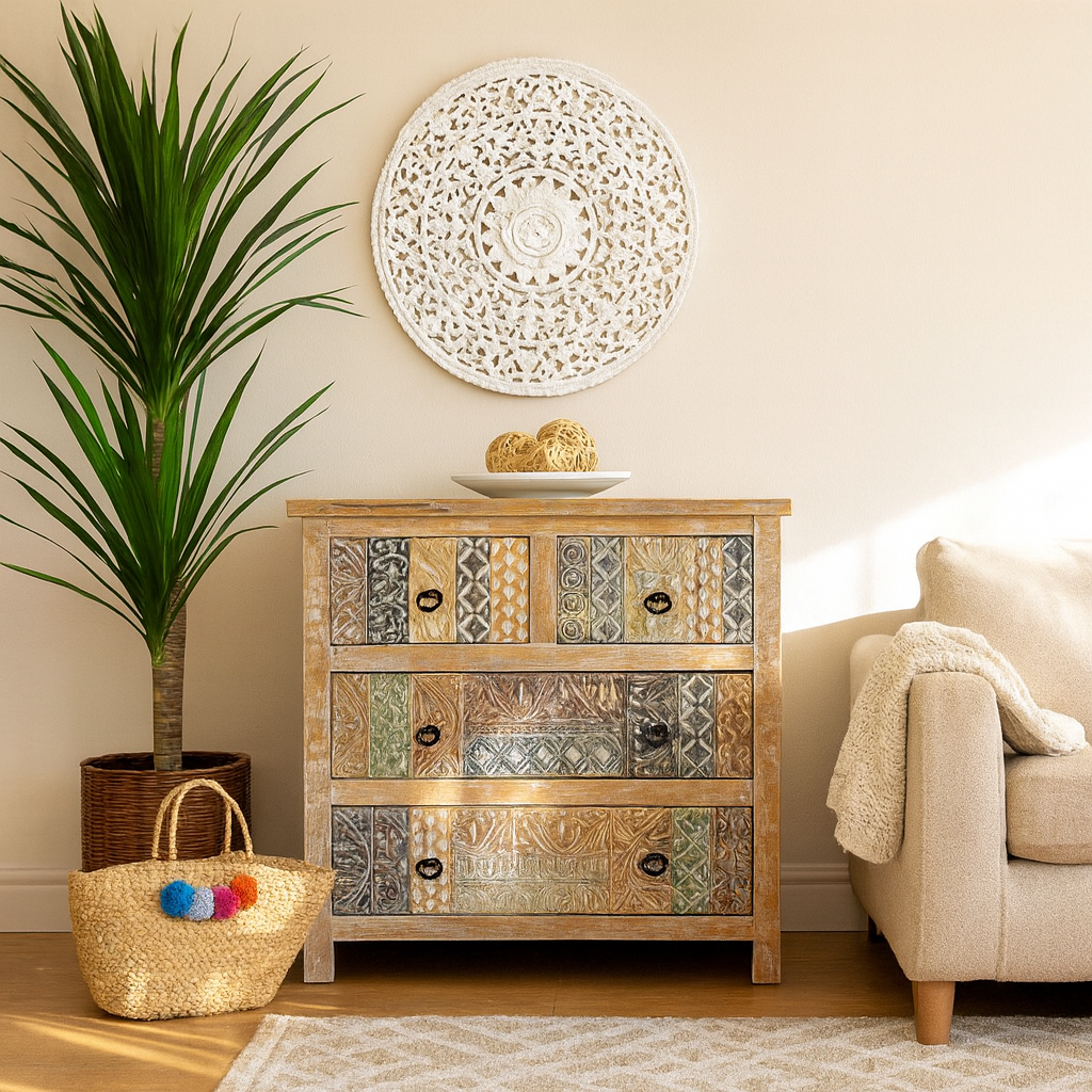 With its gorgeous panel-like hand carving and attention to detail, this chest of drawers is a stunner!