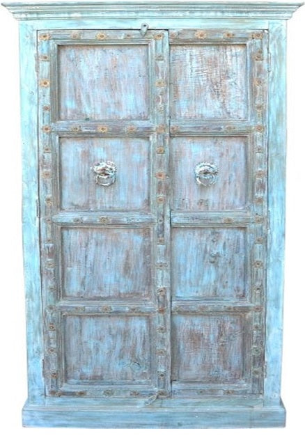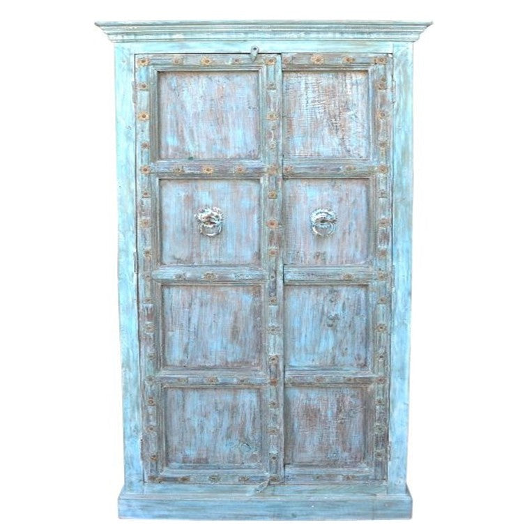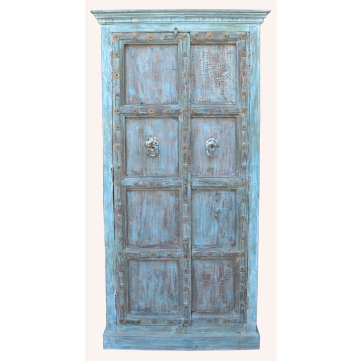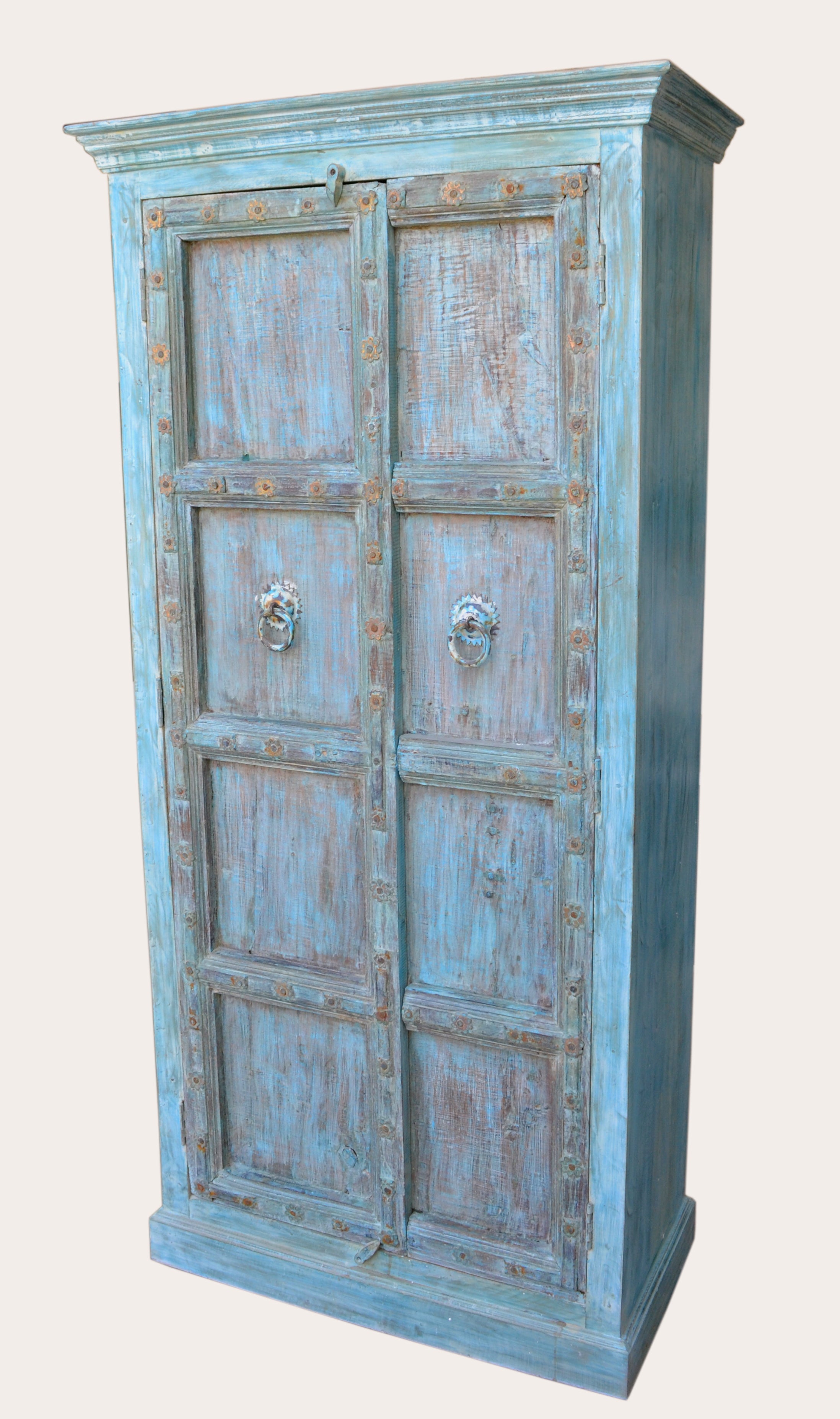 Our hand carved, blue finish tall cabinet can be a perfect cupboard.