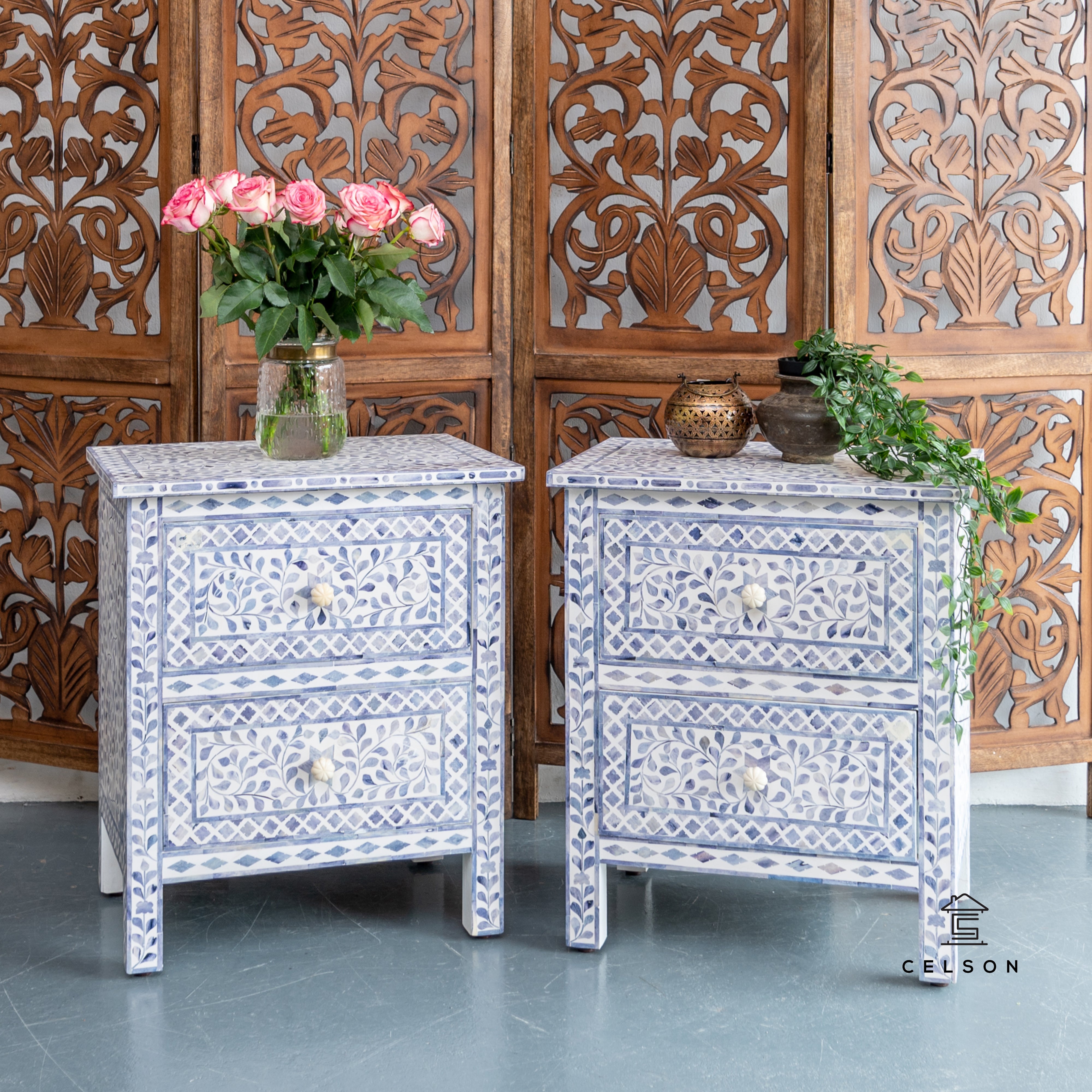 This bone inlay bed side table comes in a blue finish & has two doors & one drawer to store all your bed time essentials.