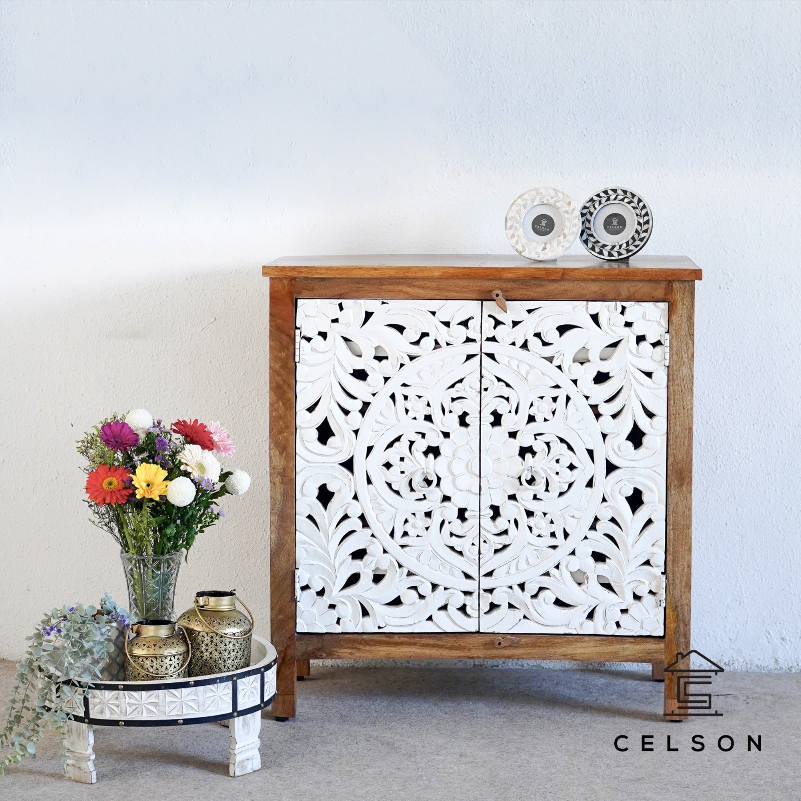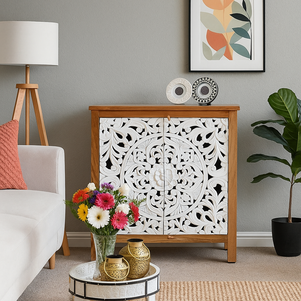 White distress isn’t just a color—it’s a statement!  This hand-carved cabinet features stunning, intricate doors, complemented by natural wood color accents on the top, bottom, and sides. With an interior shelf for storage, it’s the perfect mix of beauty, function, and timeless charm."