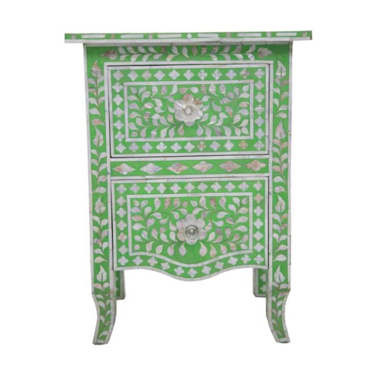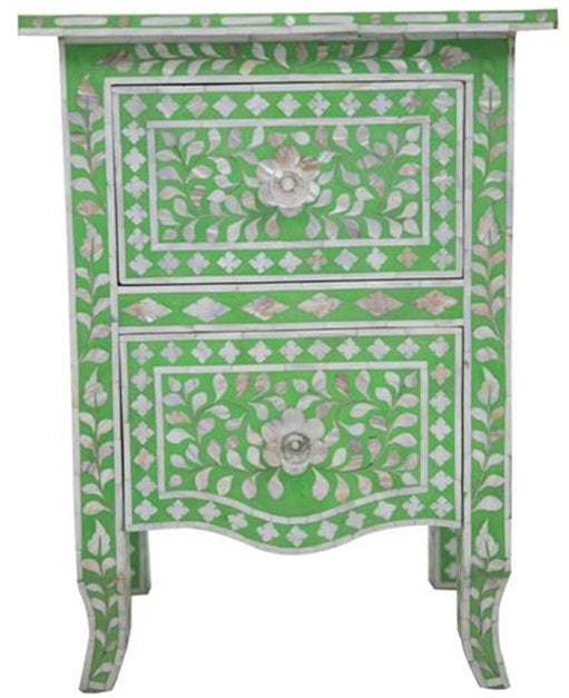 A bone inlay bed side table can completely transform the look & feel of any bedroom with its gorgeous pattern & color. This one here is a masterpiece with its floral pattern set in green color & knobs to match.