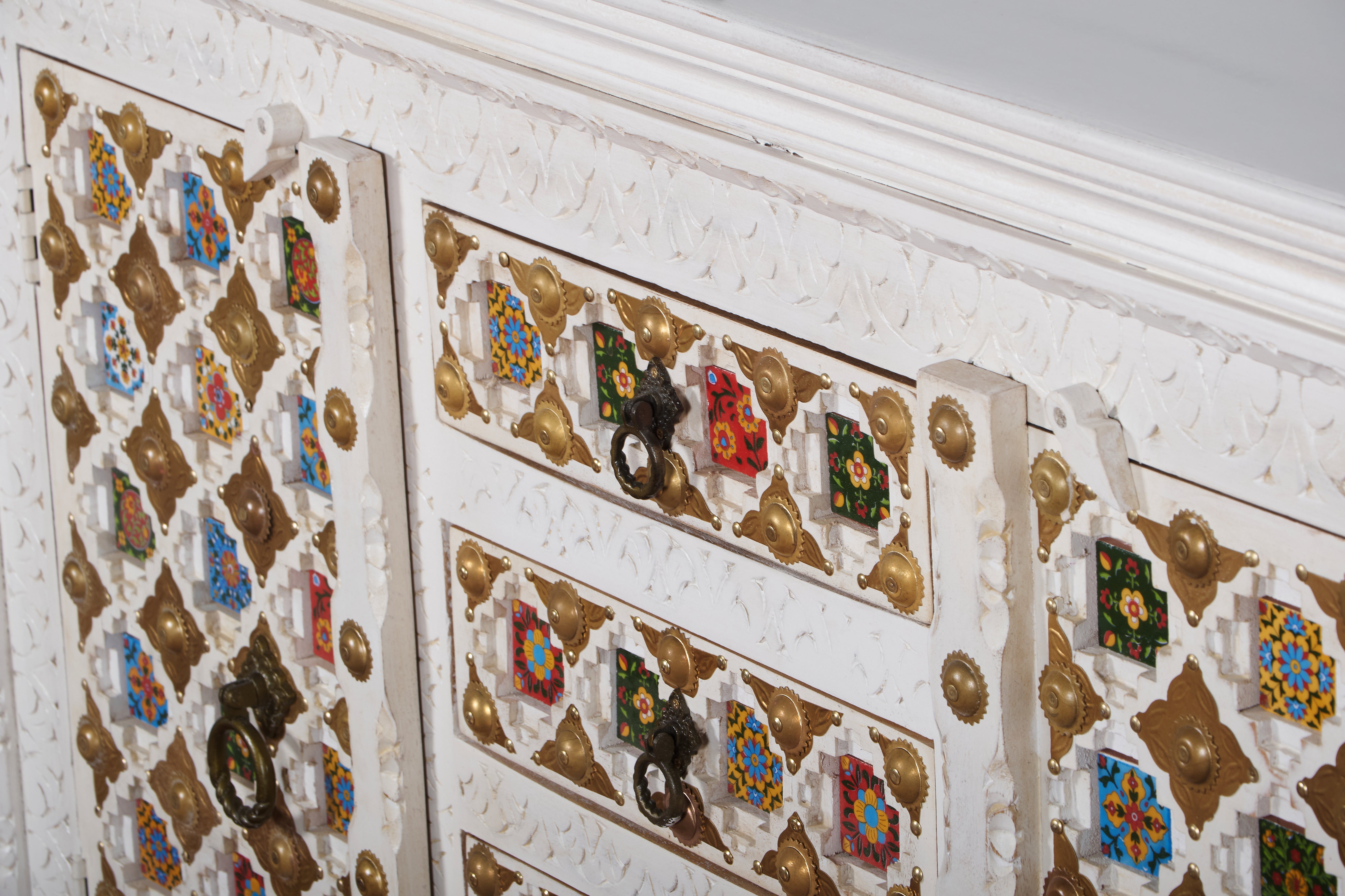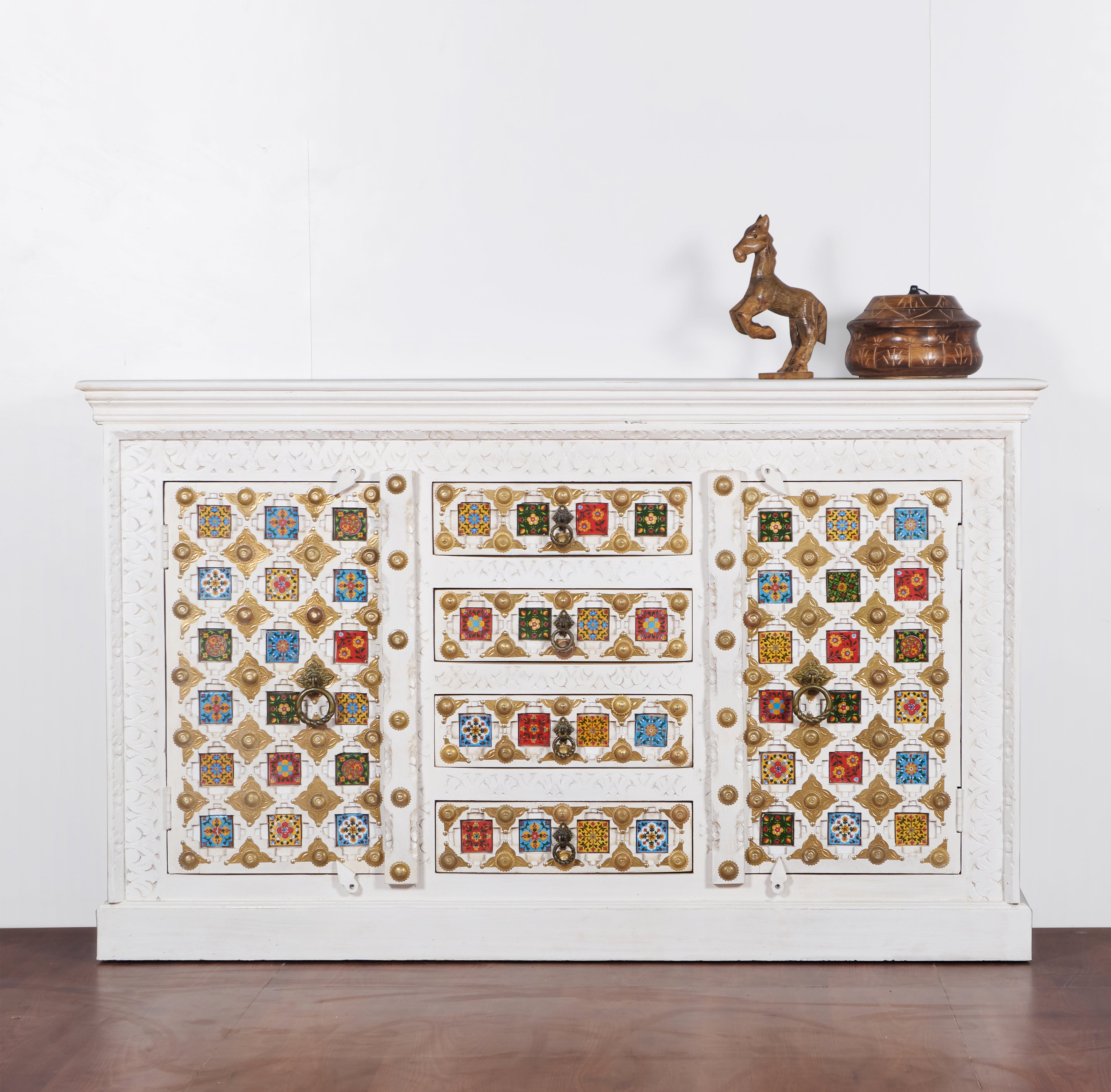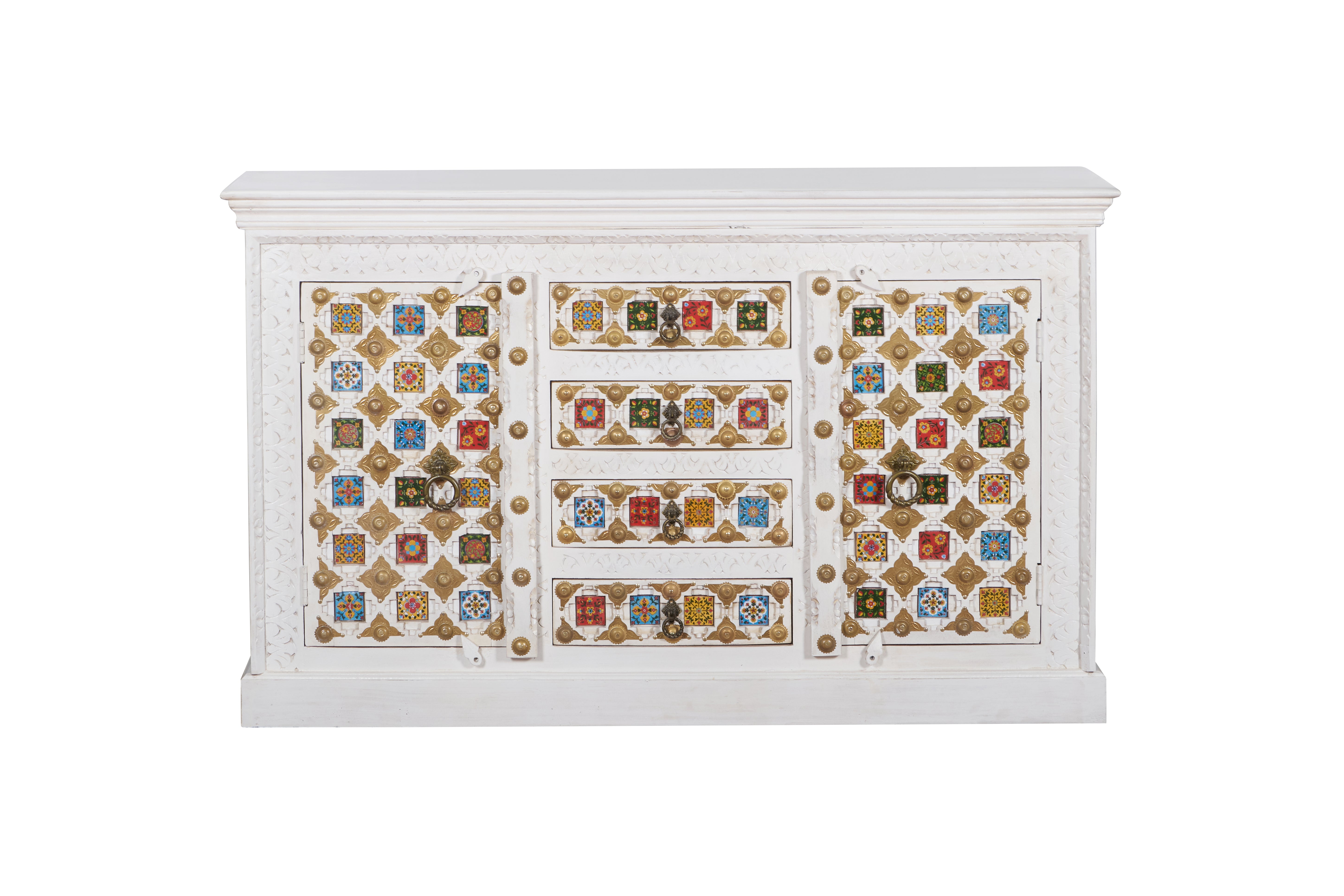One sideboard, endless uses. Featuring vibrant ceramic tiles, 2 doors, and 4 drawers - perfect for dinnerware, clothes, books, and gadgets.