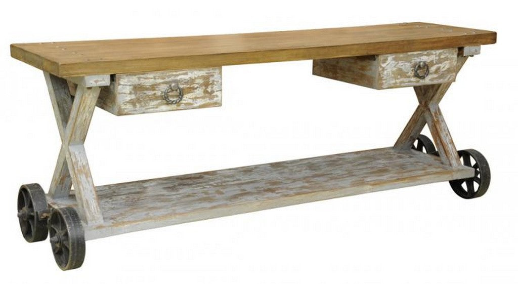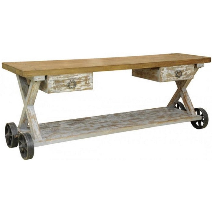 This console table comes in a cart style design with 2 drawers on the top and a shelf at the bottom. The leg structure is in a cross pattern that meets the bottom shelf near the wheels.