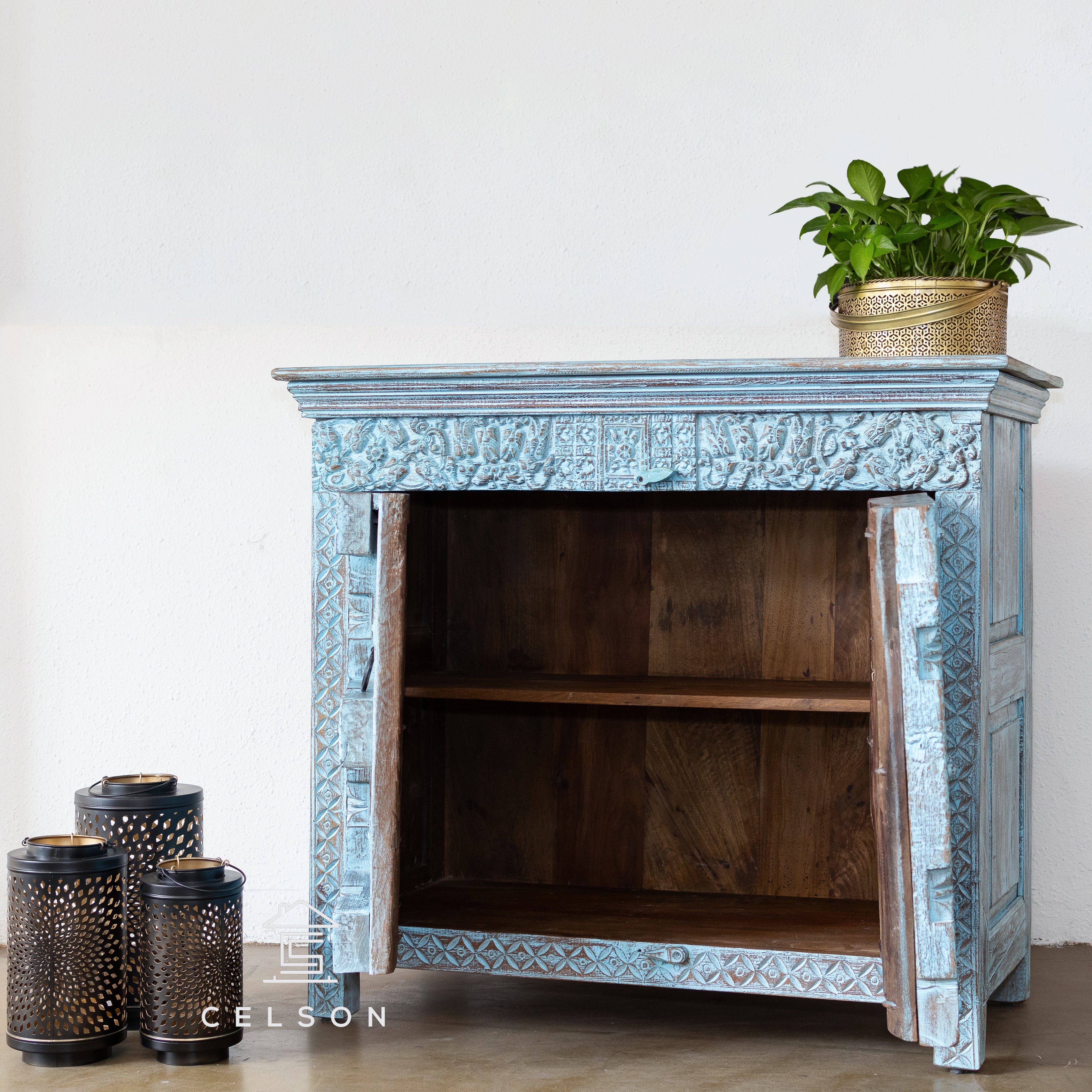 Rustic charm meets vibrant blue! This vintage reclaimed wood cabinet features hand-carved designs and metal pulls, with two doors that combine beauty and function.